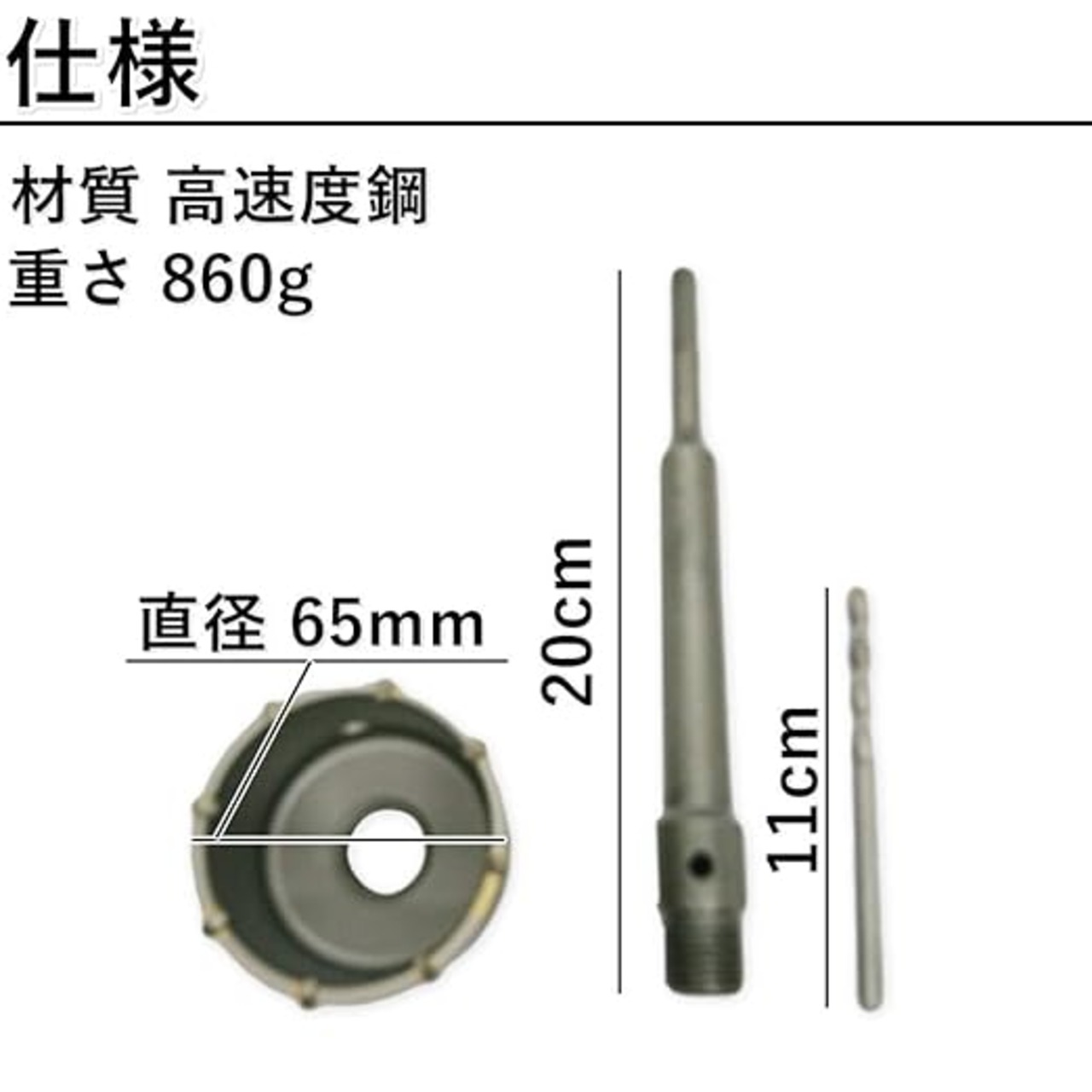 【サイズ】コアドリル 直径 65mm 他図参照 【重さ】200g 【材質】高速度鋼 【色】銀(シルバー) 【付属品】コアドリル 1、アダプター 1、ドリルビット 1