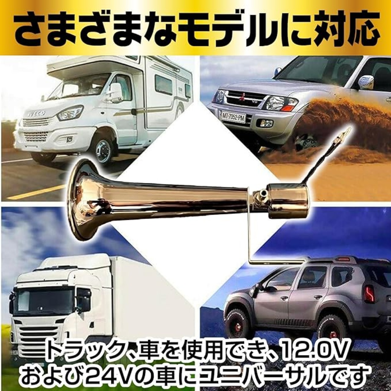 【商品】このクラクションは、トラック.ダンプカー等さまざまな車両に適しており、12.0Vおよび24Vの車種に雨や雪でも対応できる防水設計。
