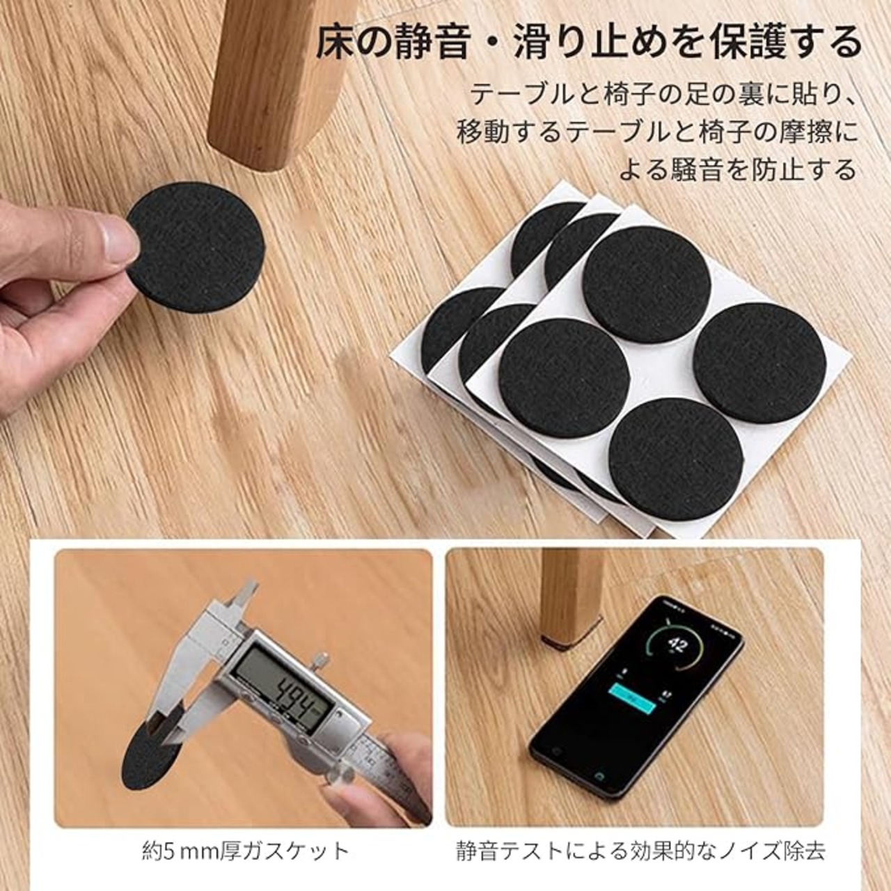 【製品規格】直径50 mm、厚さ5 mm、黒色24枚入り、高密度、耐摩耗性、長期にわたり粘度を保持することができる。 【良質な材料を採用】家具保護マットは環境に優しい高強度繊維で作られており、耐摩耗性がよく、異臭がなく、長期使用で損傷することがなく、人や環境に危害を及ぼす心配がない。強力なテープを採用しており、いくら机や椅子を動かしても外れにくい。 【汎用性】椅子脚、金属家具、本棚、ソファ、花瓶、音響機器などに使用でき、隙間に貼り付けることもでき、揺れ防止にも使用できる。 【騒音防止】カップ底とドアノブが接触する壁面などの他の場合にフェルトマットを貼り付け、接触時に発生する騒音を低減し、電子レンジ下に置いて振動を防止することで機器を保護することができる。音響、OA機器などの足裏に貼れば、音を吸うこともできます。 【DIYできる】大径のフェルトマットなので、必要に応じてさまざまな形や大きさにカットすることができ、テーブルや椅子、テーブルなど家具の足の裏側に貼るだけで、使い勝手はとても簡単です。