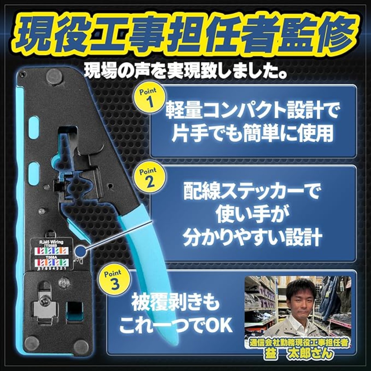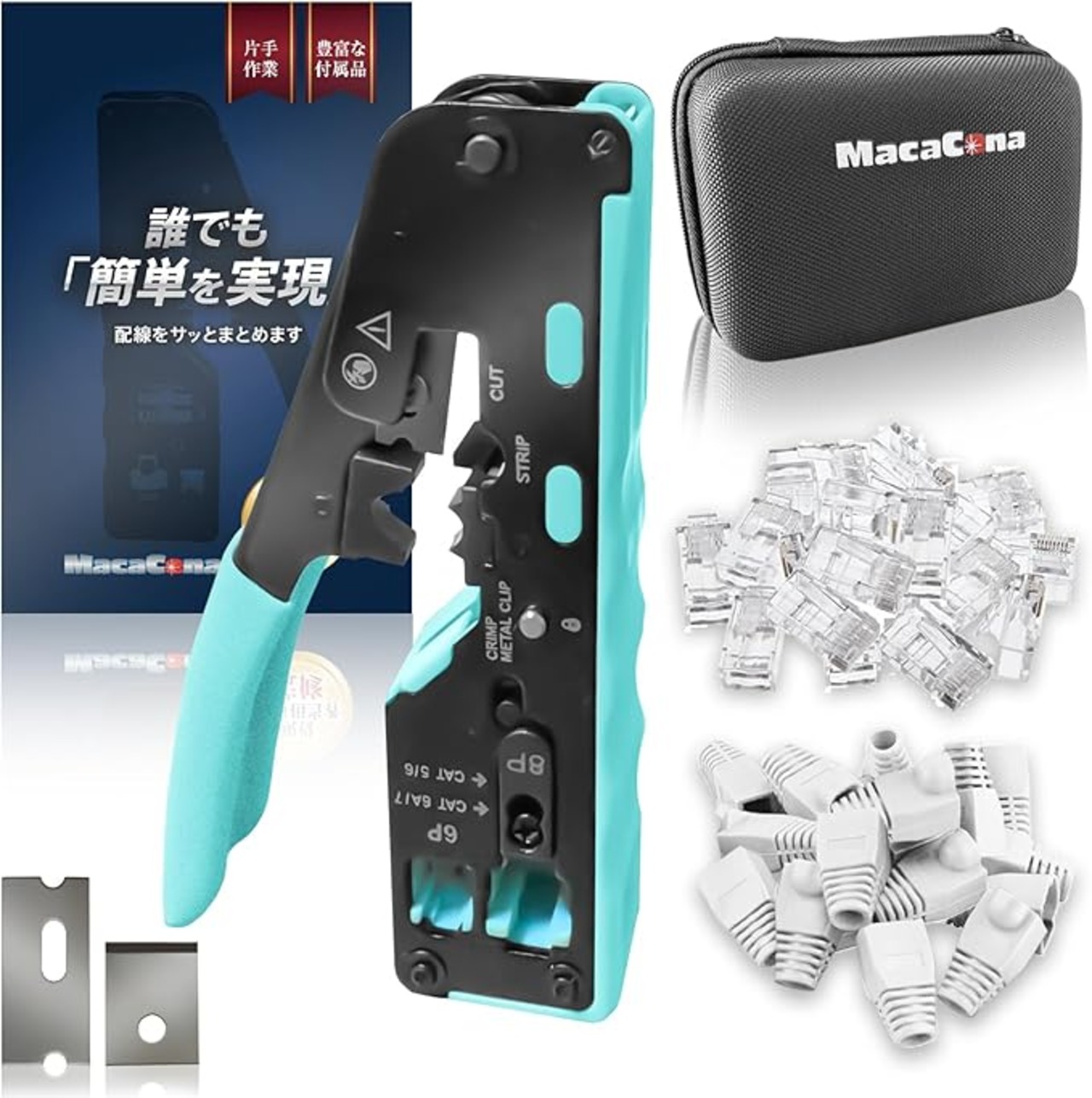 【現役工事担任者監修】 圧着工具 かしめペンチ LAN ケーブル製作 CAT5e/CAT6/CAT7対応 CAT5e/CAT6用RJ45貫通型コネクター付属 RJ12対応 配線図 替刃付き(AP001G) 【MacaCena(マカセナ)】