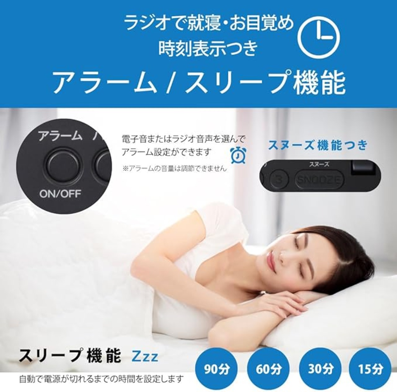 ● デジタル時計付き、アラーム(スヌーズ機能付き)とスリープ(自動電源OFF)設定もできます。アラームはラジオと電子音から選択できます。