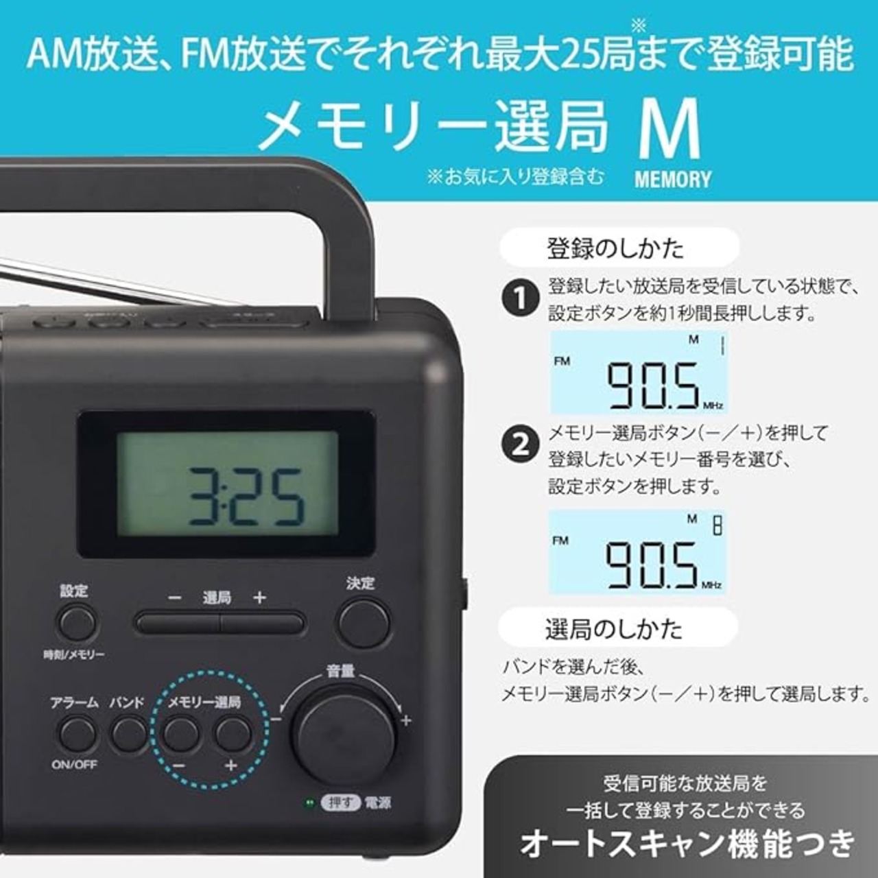 ● オートスキャンで受信可能な放送局を一括でメモリー登録(AM/FM各22局まで登録可能)