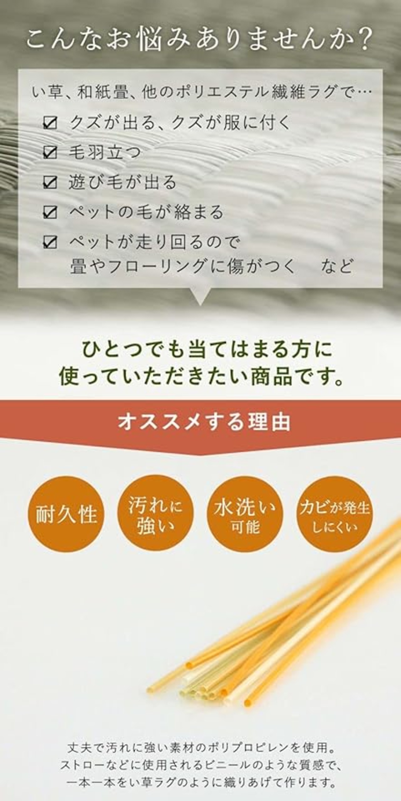 強度が高くしっかりとしています。 汚れても水洗いができるので、いつでも清潔にお使い頂けます。 カビが発生しない素材なので、カビを食するダニなども寄り付きにくいです。 一般的な除菌スプレーで拭いても色落ちせず、常に清潔な状態を保つことができます。 繊維が毛羽立つことが無く、埃が出にくく、日頃のお掃除が楽になります。 リビング、ダイニング、お子様のお部屋、など様々なシーンで活躍します。 ※ 畳のお部屋に上敷きとして使用する場合は市販の上敷き鋲との併用をおすすめします。 ※ 滑りやすい床等で使用する場合は市販の滑り止めシートとの併用をおすすめします。 ※ 掲載写真は表記サイズと異なる場合がございます。 ※ 画面上のカラーはご使用ブラウザやモニターの設定により、実物とは若干異なる場合がございます。あらかじめご了承の上、ご注文をお願いいたします。