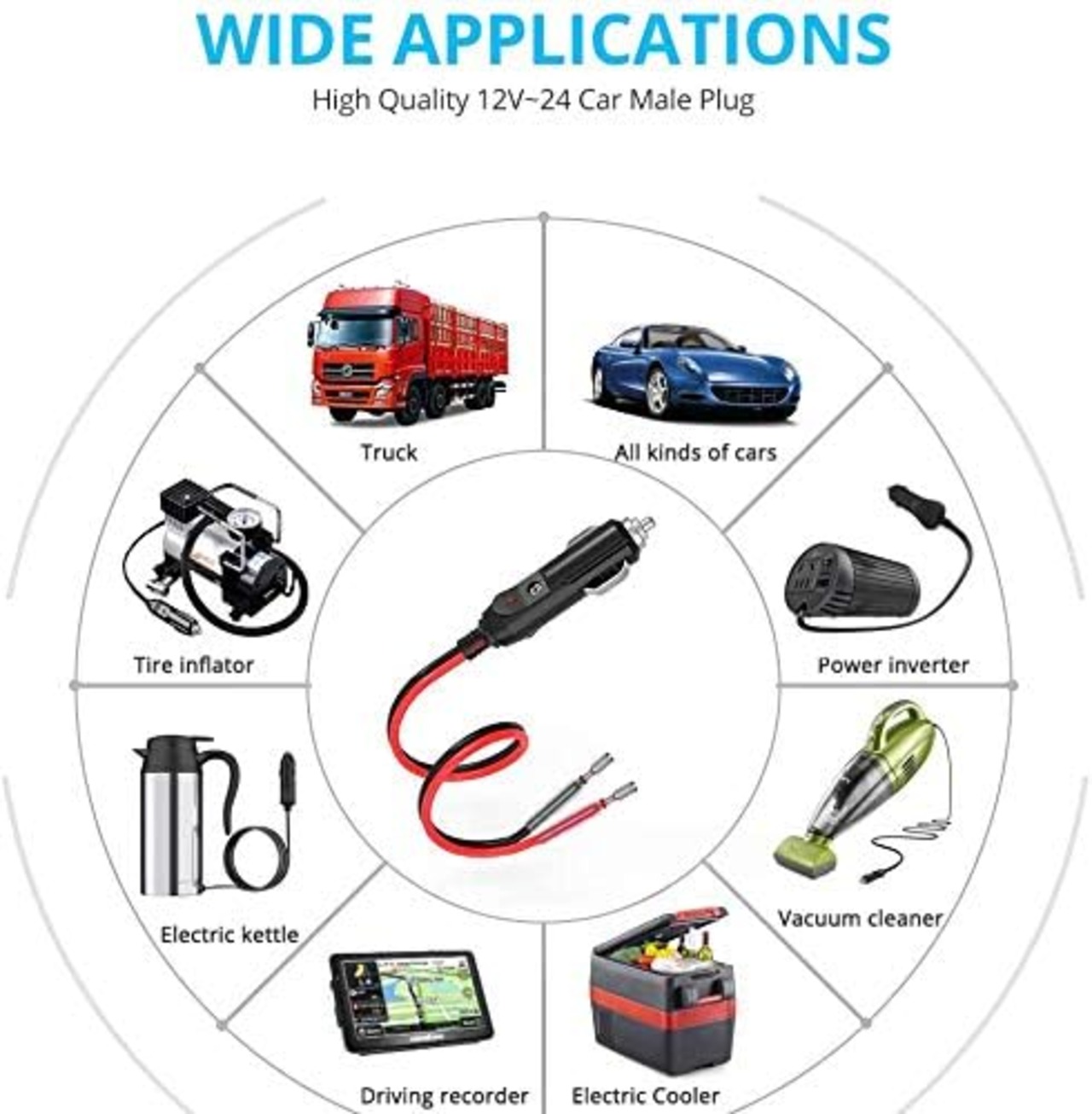 ★ シガレットライタープラグは、DC 12V / 24V車両のあらゆる種類のシガレットライターソケットに使用されます。例:車の毛布、クッション、電気ケトル、車のクリーナーなど。出力電圧はデバイスと同じです。