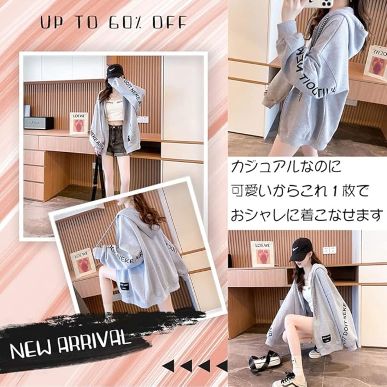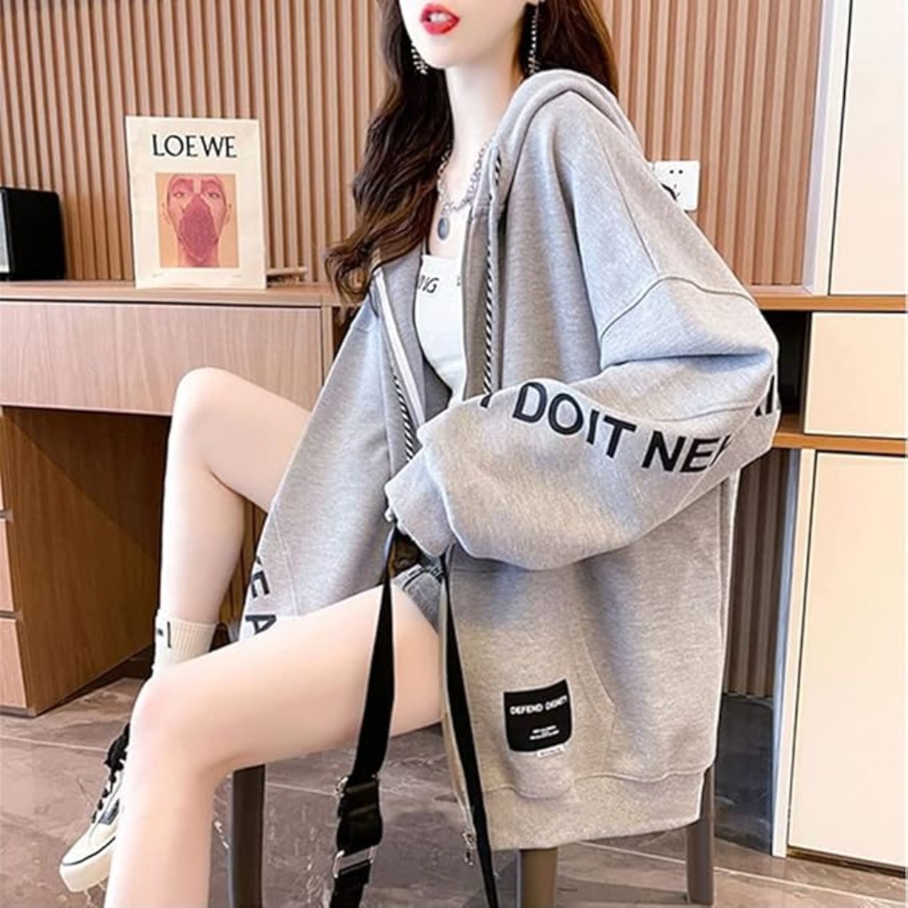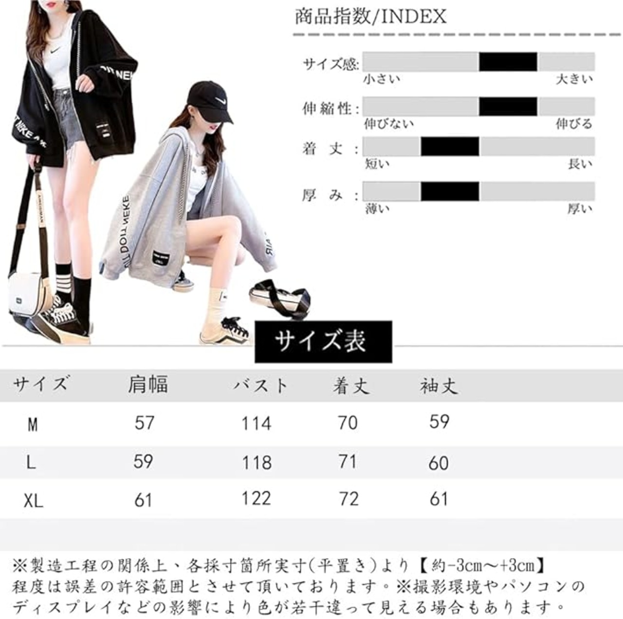 [fyetemon] 薄手 ゆったり オーバーサイズ パーカー 長袖 フロントジップ 韓国風ファッション 春 秋 冬