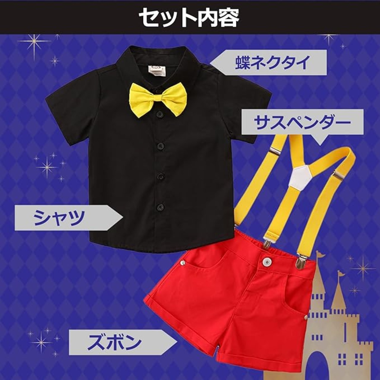 キッズセットアップ、90cm、110cm、シャツ(ブラック)、ショートパンツ(レッド)、サスペンダー(イエロー)、蝶ネクタイ(イエロー、ボタン着用タイプ)、コットン※モニターの環境により色の見え方に若干差が生じる場合がございます。