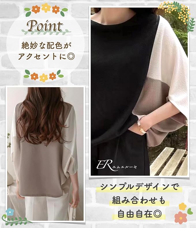 大人かっこいい! パッチワーク風の配色デザインがお洒落なバイカラーTシャツの登場です◎ シンプルデザインでも1枚でキマる! 綺麗め大人コーデが楽しめる五分丈袖のシャツ♪ 首元はキレイ魅せを叶えるラウンドネックで、ボディ部分のトリプルカラーの絶妙な配色がアクセントに! 着心地が良く、体のラインを出しすぎないリラックスした着用感とシンプルデザインならではの、多様なコーディネートをお楽しみいただけます♪ 顔周りがスッキリ見えて、抜け感&こなれ感を演出してくれるトップス! ドルマン袖デザインは、シンプルなデザインのアクセントに◎ ゆるりと気になる二の腕もしっかりカバーしてくれる優秀な今季一押しアイテムです♪