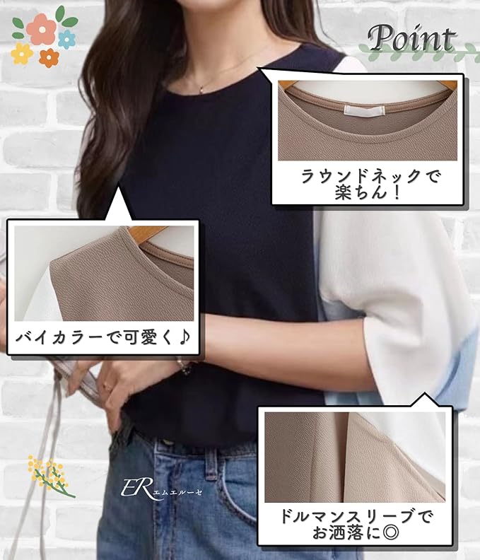 [エムエルーセ] バイカラー カットソー ボートネック 7分袖 無地 トップス ドルマンスリーブ 春 夏 秋 レディース