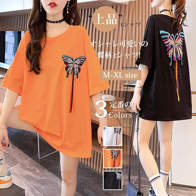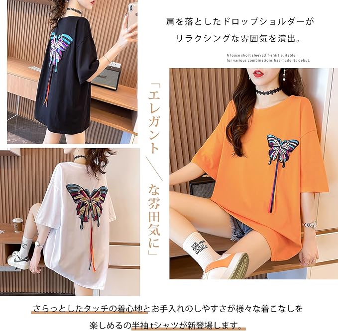 [HuuMeNEIDOO] tシャツ レディース 半袖 ロングtシャツ 刺繍 蝶柄 ティーシャツ 丸首 トップス カットソー プルオーバー ゆったり 体型カバー オーバーサイズ 速乾 韓国 ファッション 普段着 春 夏 秋