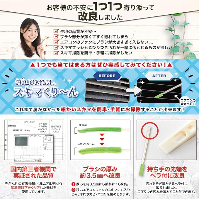 【日本国内の検査機関で品質試験済み】HOLOMUAの エアコン掃除 ブラシ は発がん性の有害物質(ホムアルデヒド)が基準値以下であることを確認しております。品質・安全にこだわって日本企業が設計・開発を手掛けました。