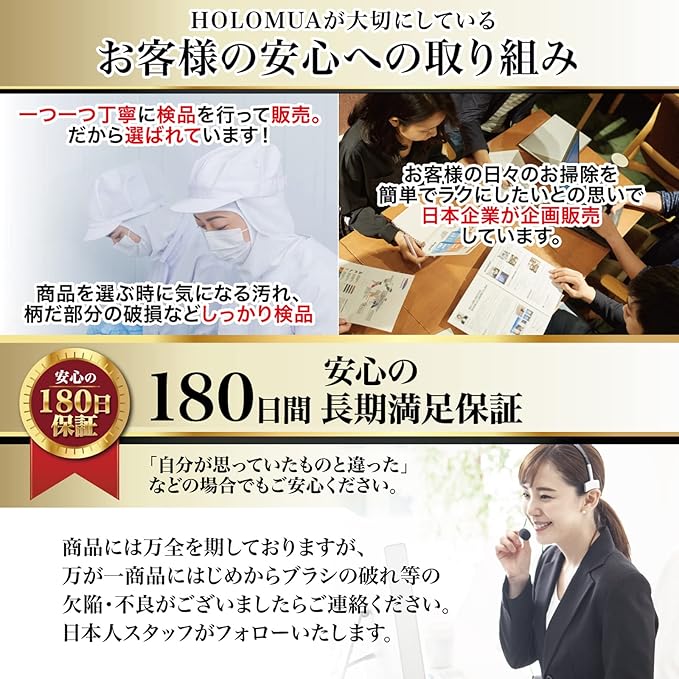 【安心の180日間長期保証】「インターネットでの買い物は、実際に商品を手に取って触って選べないから不安…。」 そんなお客様にも安心してお選び頂けるよう、HOLOMUAでは独自の180日間長期保証対応を行っています。万が一、当社の 掃除 ブラシ ( 隙間ブラシ )にご満足いただけない場合や、商品に不具合があった場合はお気軽にご連絡ください。すぐに交換・返金等の対応を取らせて頂きます。