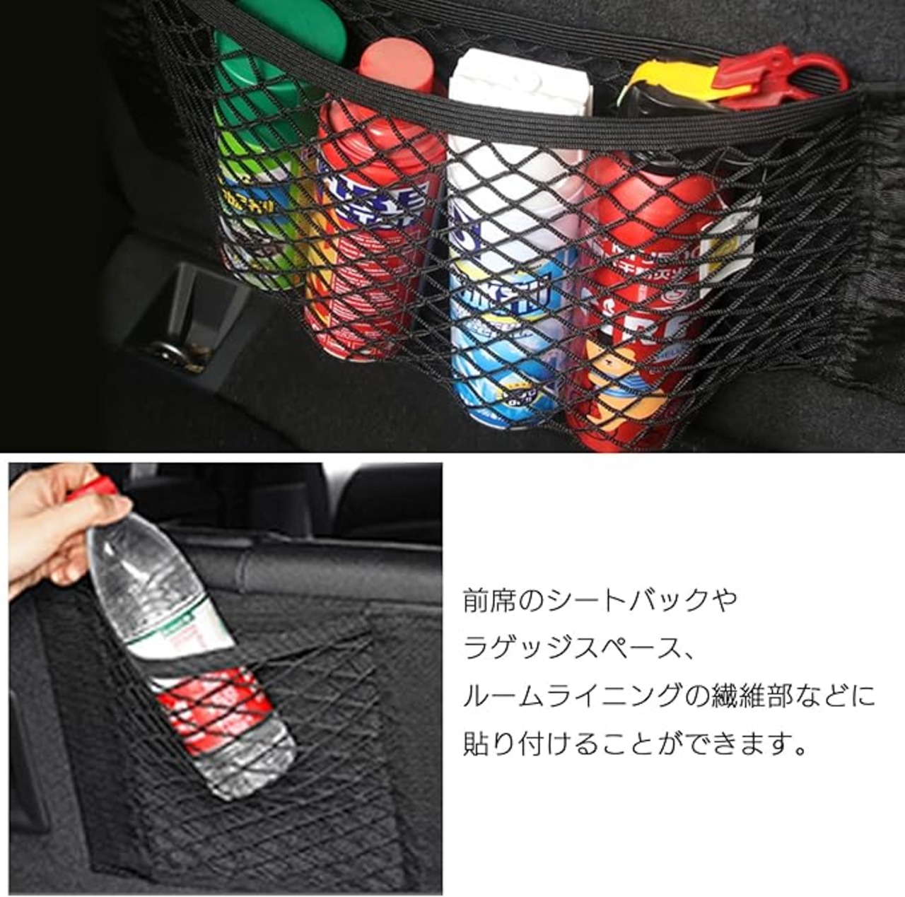 傘やティッシュボックス、ペット用品、スマートフォン、小物類など、さまざまなアイテムを収納できるため、車内の散らかりを防ぎ、すっきりとした空間を維持できます。後部座席の遮断用メッシュとしても活用できる多機能設計で、使い方次第でさらに便利に利用できます。