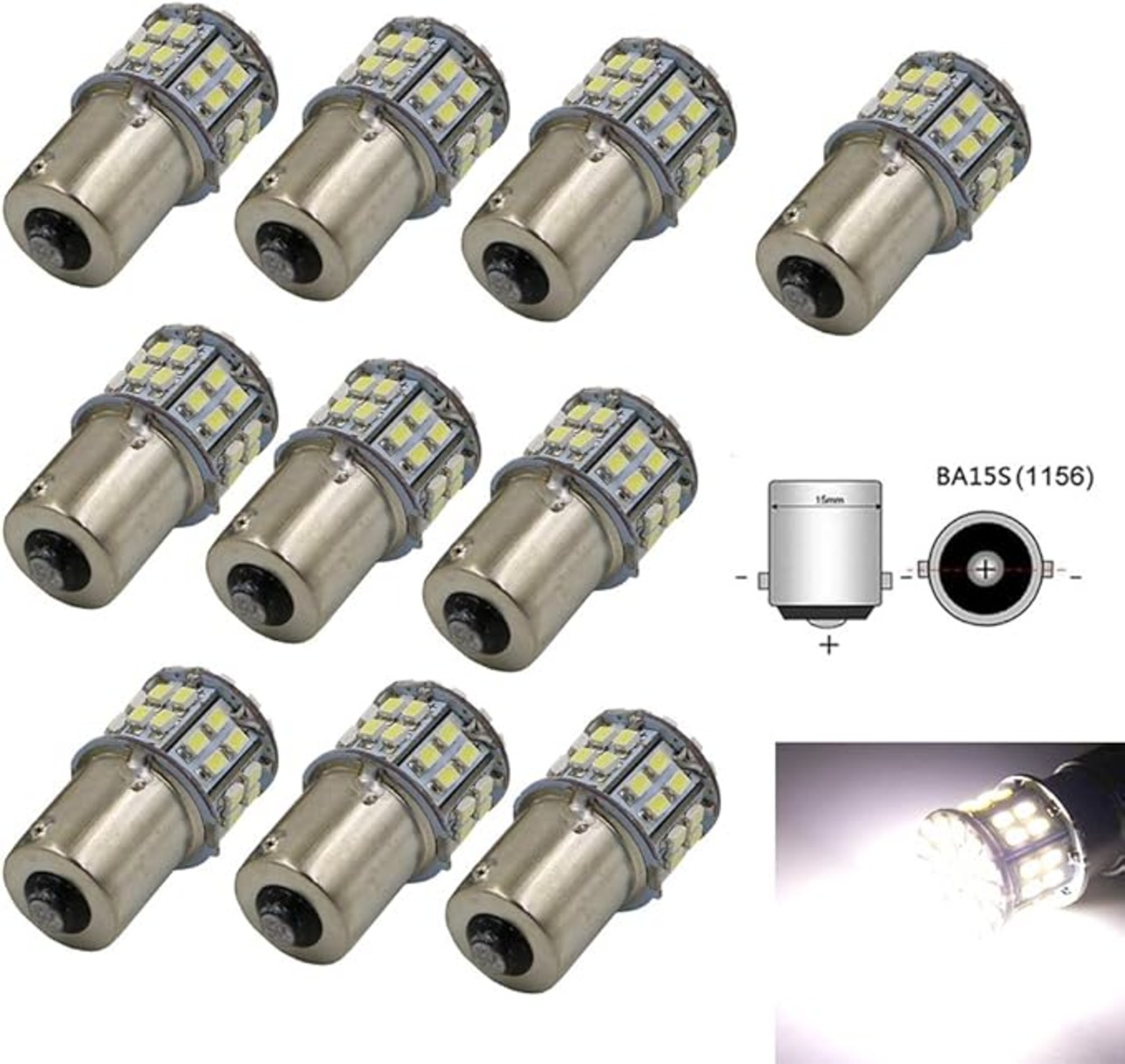 商品内容:バルブ10個。 形状:S25 BA15S/P21W 1156 兼用 シングル球 ピン角180度 発光色:ホワイト 6000K-6500k 対応電圧:DC12V