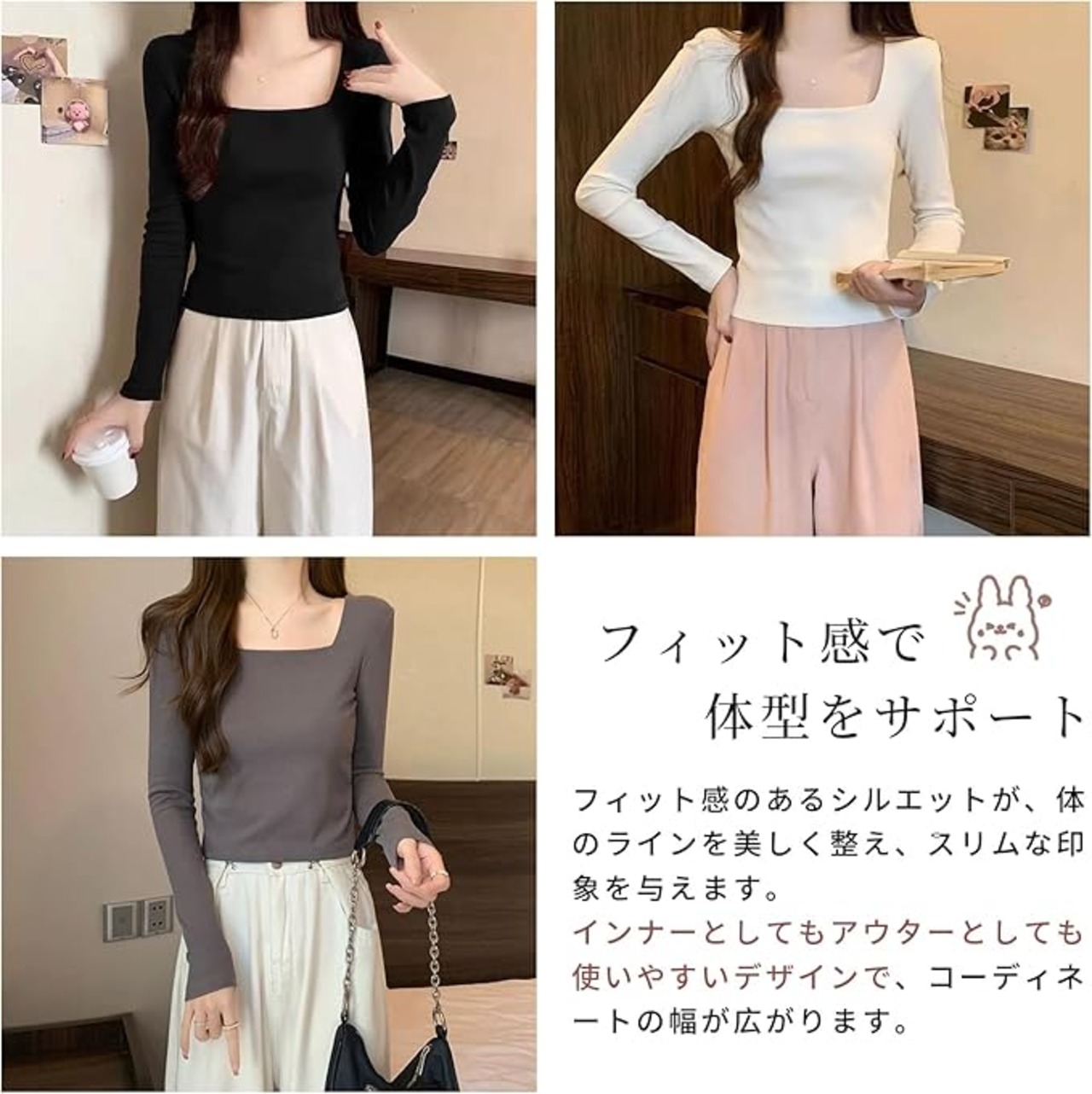 [MEME XTRA] スクエアネック Tシャツ レディース 綿 カットソー リブTシャツ 長袖 トップス 春秋 インナー フィット感 伸縮性 二重生地 透けない 無地 シンプル オフィス