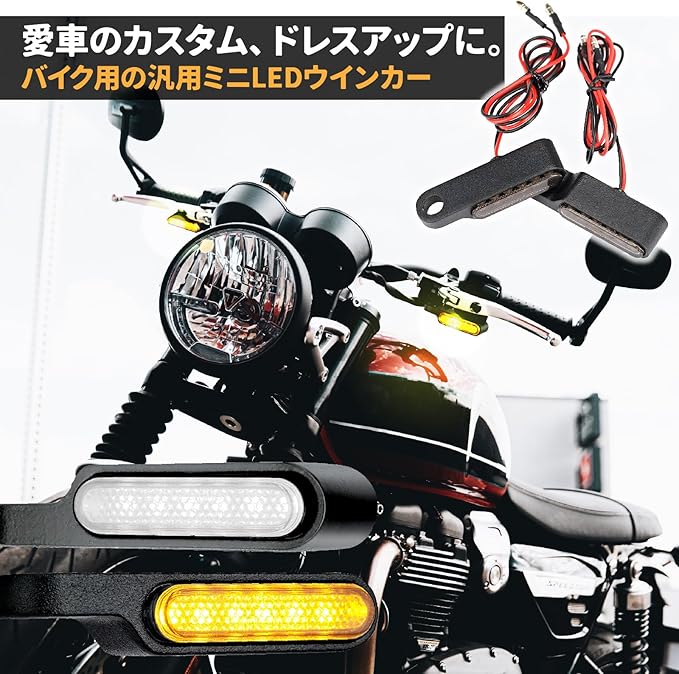アメリカン、オフロード、クラシック、スクーター、スポーツ、ネイキッドなどバイクの種類を選ばない汎用デザイン。流れるウィンカーと、ウインカーポジションのホワイトがオシャレ。コンパクトサイズなミニウインカーでバイクをクールにドレスアップ。