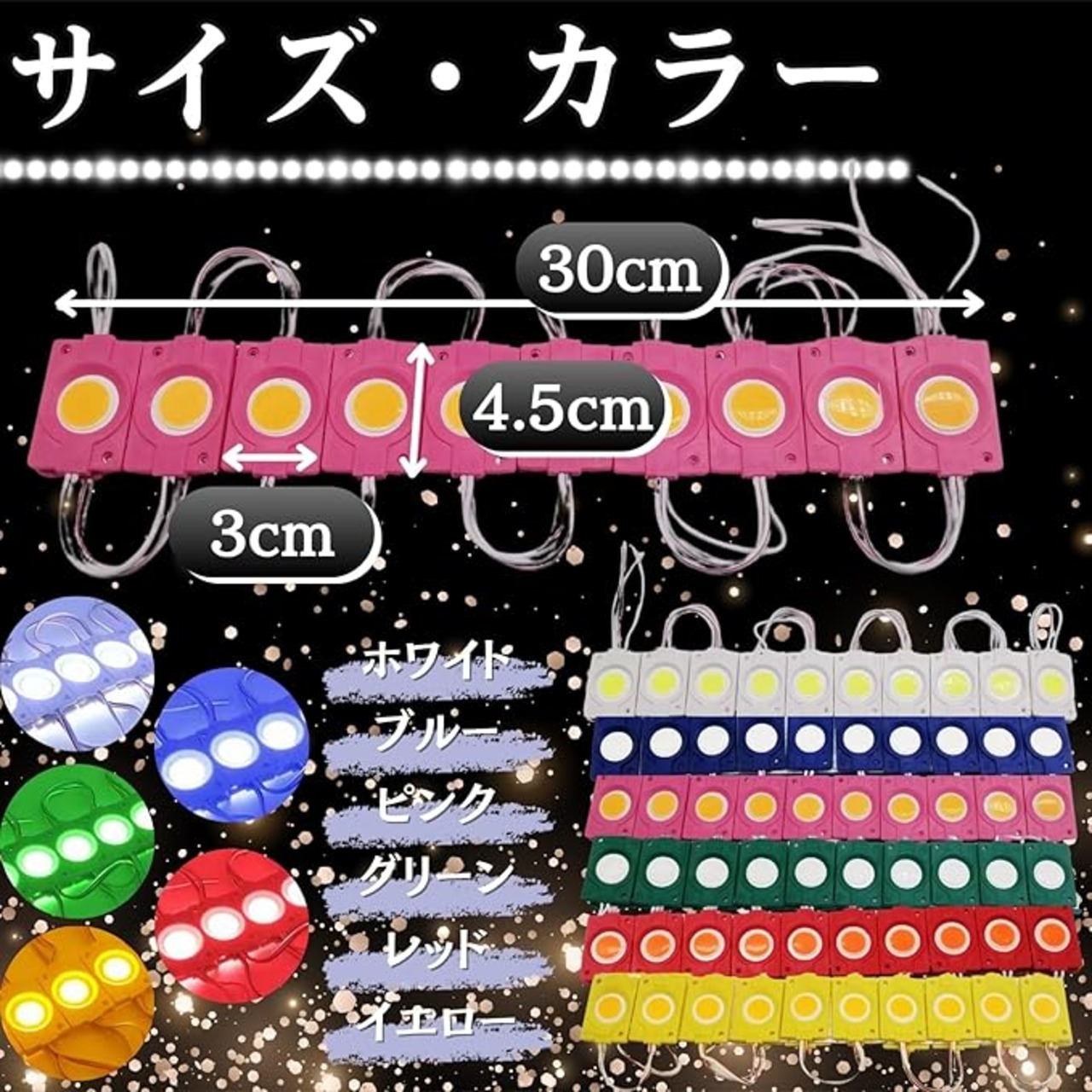 ・この商品は 【JMAEK】 にて正式に登録している商品となります。 提携工場と連携して製造、販売を行っておりますので、似たような商品があった際は同じ商品では御座いませんのでご注意下さい。 ・24Vの連結型のLEDパネルライトです。 デコトラのカスタム、トラックなどの大型車のタイヤ灯やマーカーランプ、作業灯、ダウンライト等にご使用ください。 ・夜間時の視認性アップだけでなくドレスアップパーツとしても活躍します。 ・高輝度のCOBハイパワーチップ搭載なので、でとても明るく路面を照らします。 ・防水なので雨天時や洗車時も安心してご使用できます。 ※更に防水処理することでより長く使用できます。 ・バリエーションが豊富で、20個セット、40個セットの2つのセットをご用意しています。 ・カラーバリエーションもブルー、グリーン、レッド、ホワイト、イエロー、ピンクの15色からお選びいただけます。 ※ラバー部分は若干色落ちしている事がありますが製品の素材によるものなのでご了承ください。製品の性能には問題ありません。 ・お手持ちのパソコン・スマートフォン・携帯の画像により商品のお色に若干の差がある場合がございます。 ・取り付けに関する技術的なサポートも行っておりませんので自信のない方は専門家に取り付け依頼してください。 ※説明書は付属しません。
