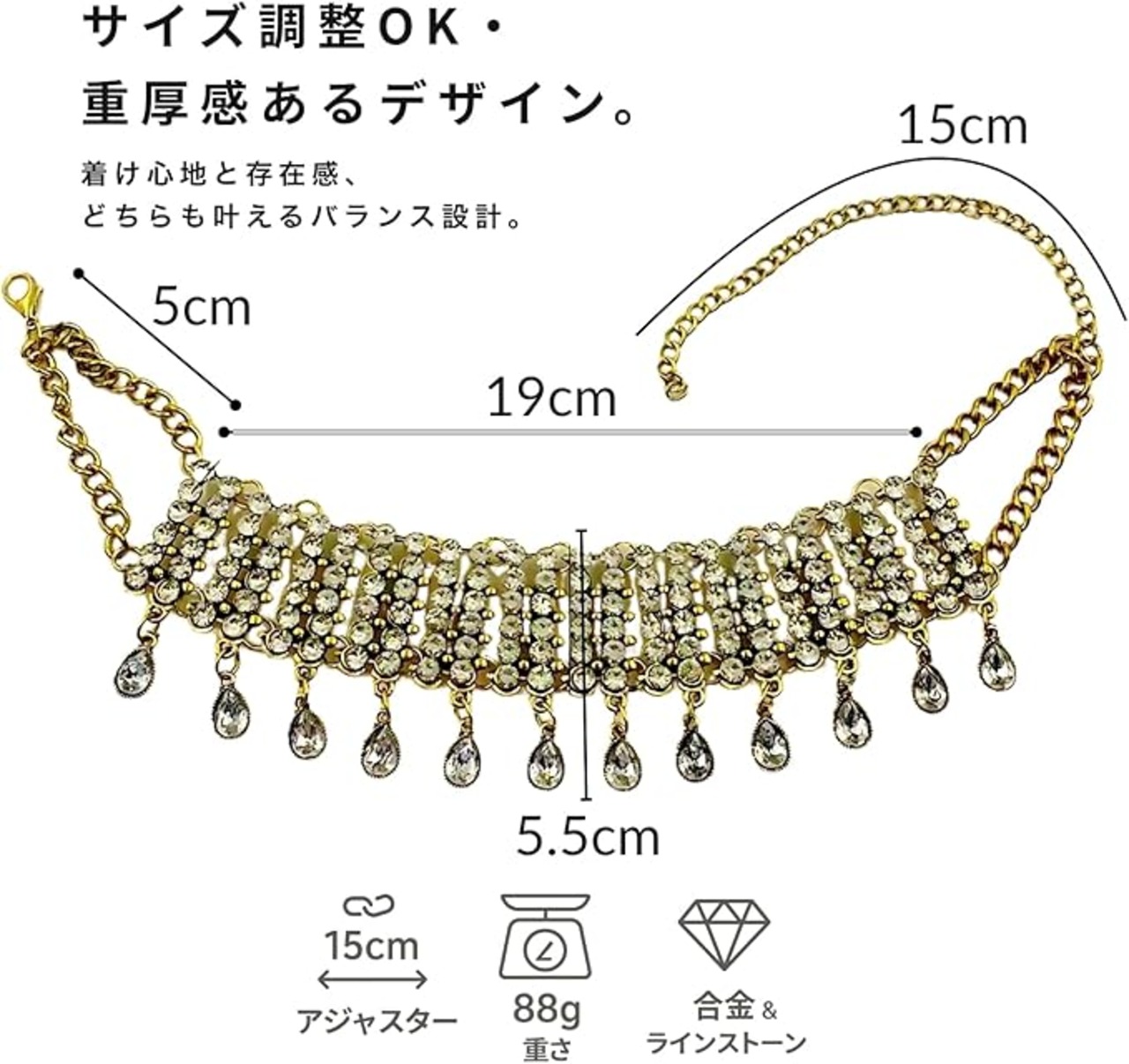 【快適さを纏う、軽やかな美しさ。一日中着用できる軽量設計】 このチョーカーは、長時間の使用にも耐える快適さを提供します。肌に優しい素材で作られており、軽量ながらも品質を保持します。調節可能なクロージャーは、個々のニーズに合わせて簡単にサイズ調整が可能です。パフォーマンス中も美しさを保ちながら、快適性を損なわない設計です。 ネックレスにはフリンジが付いており、踊りの際に美しい動きを演出します。トップスやシフォンベールとの相性も抜群で、踊り子の魅力を引き立てます。指やアームレット、二の腕、腕用のバングルやブレスレットと合わせて使うと、さらに華やかさが増します。