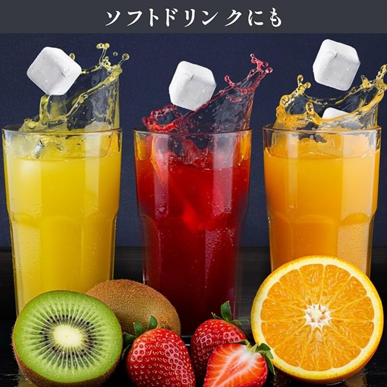 各辺2.8cmの大きめの誤飲防止サイズで、保冷力・安全性を両立。 アイスキューブ12個(2〜3杯分)/コースター2枚/蓋付きケース/トング/説明書/180日保証書/BOXサイズ:17 12 高さ5cm
