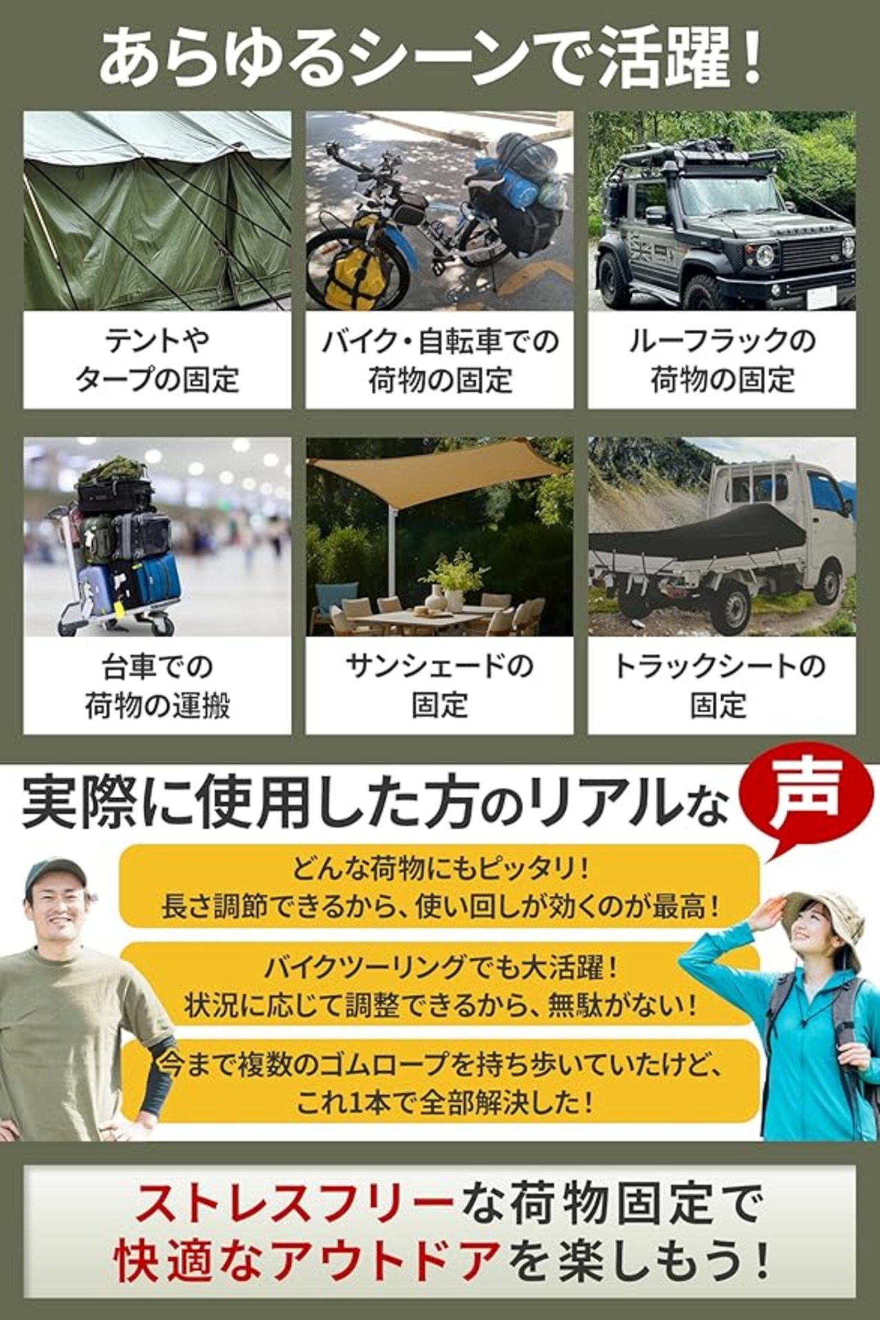 ✅ 【キャンプ・アウトドア・車・バイク・DIYに最適】 テントやタープの固定、車・トラックの荷物整理、車のルーフラックやバイクの荷物固定など、幅広い用途に対応!