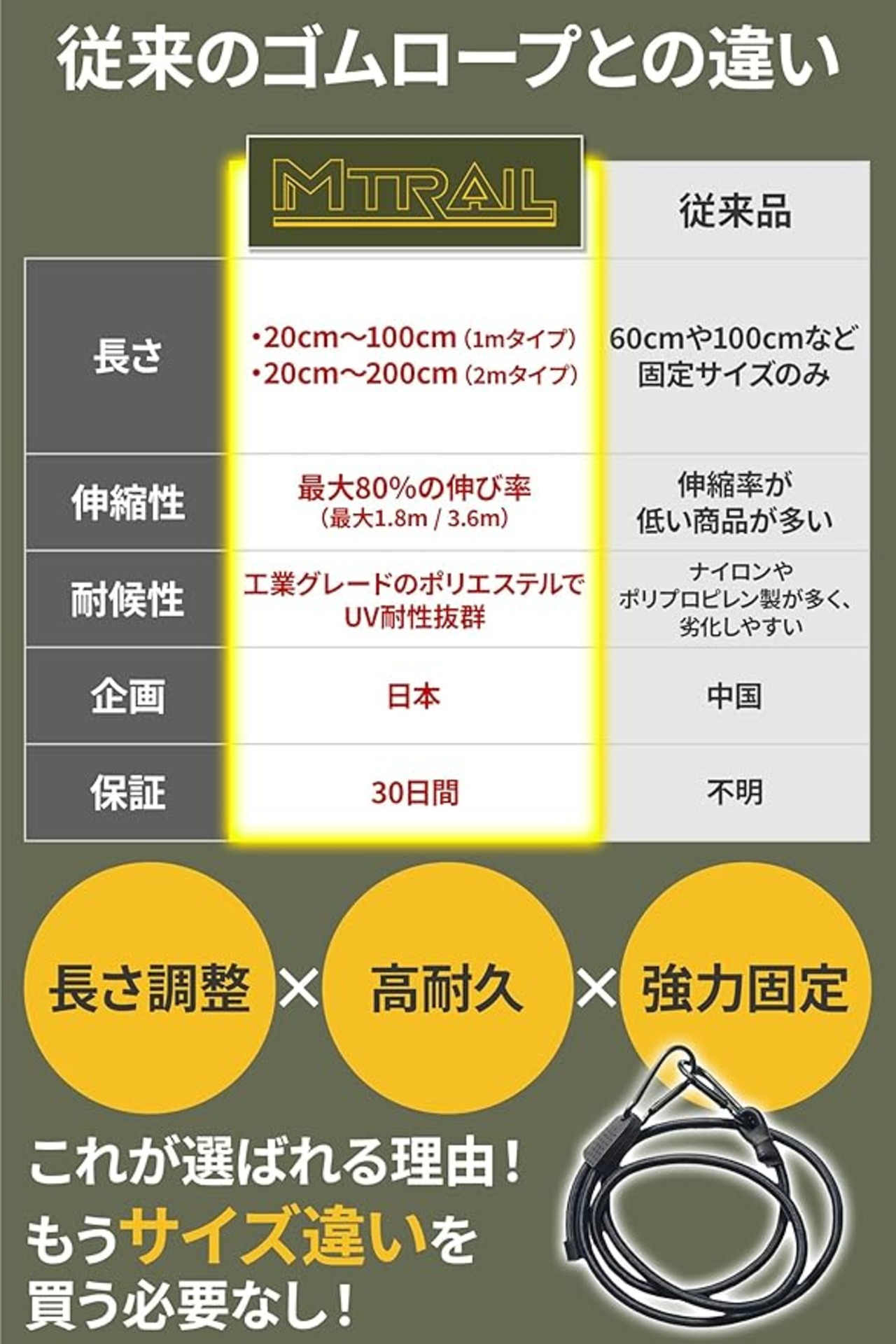 ✅ 【強力ゴム採用】 伸縮率80%のラテックスゴムで強い弾力と固定力を実現。必要以上に伸びないことによるがっしりと荷物をホールドし、荷崩れを防ぐ!