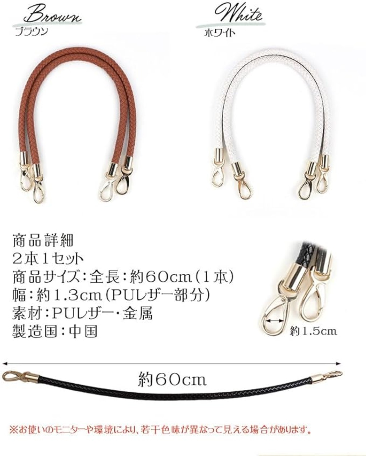 全長:約60cm(1本) 幅:約1.3cm(PUレザー部分) 素材:PUレザー・金属 内容量:2本