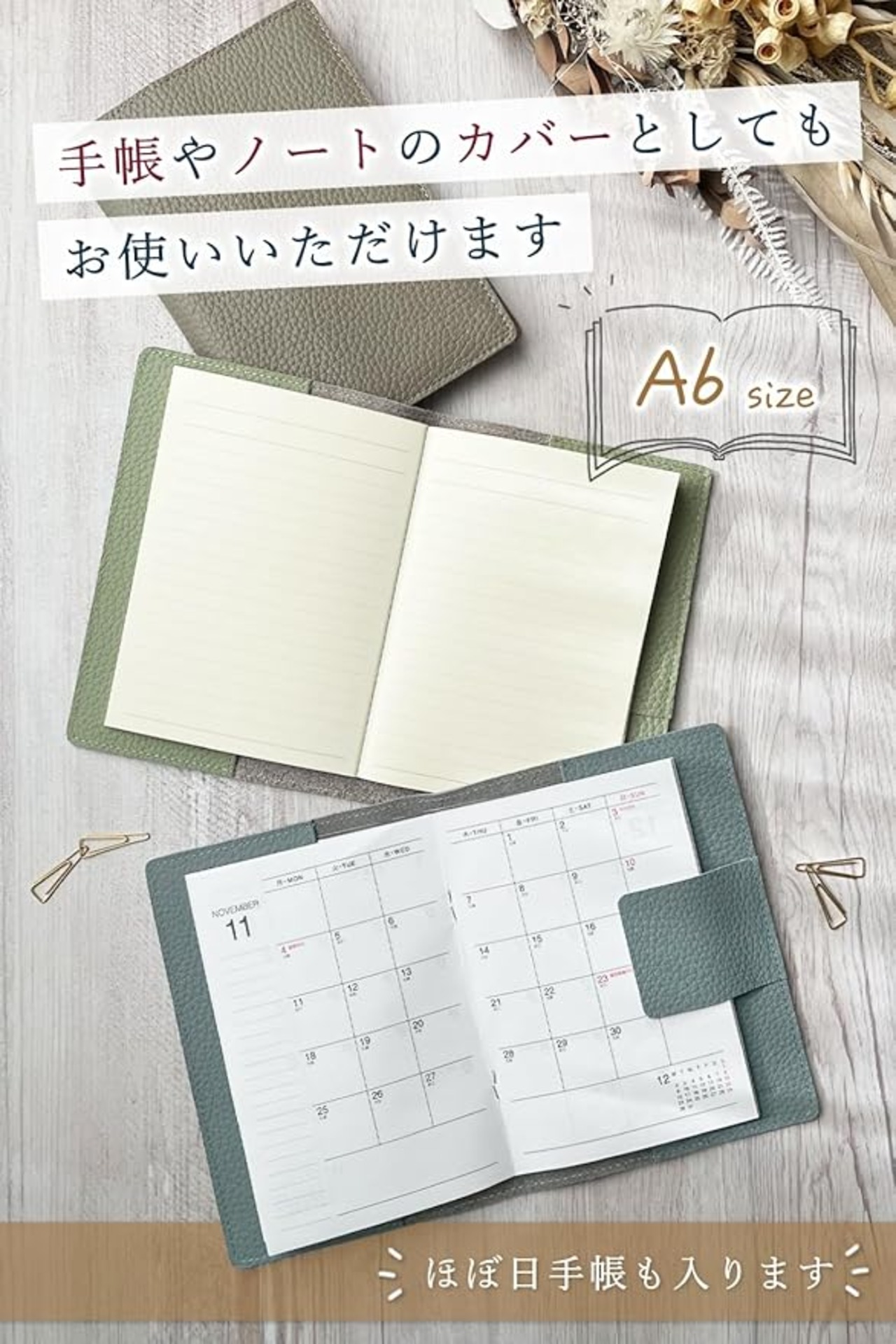 【手帳カバーやノートカバーとして】こちらのブックカバーはA6サイズとなっておりますので、手帳やダイアリー、ノートなどのカバーとしてもお使いいただけます。