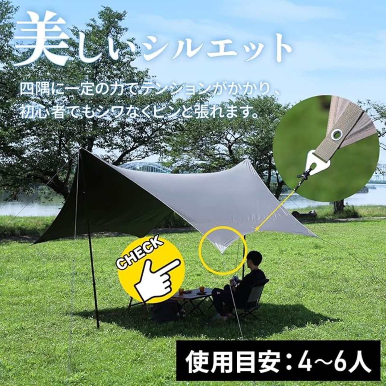 様々なキャンプサイトやシーンに合わせやすいベーシックなヘキサゴンタープ。ファミリーで使える大型サイズ。ハンギングチェーン装着用のループ有り。