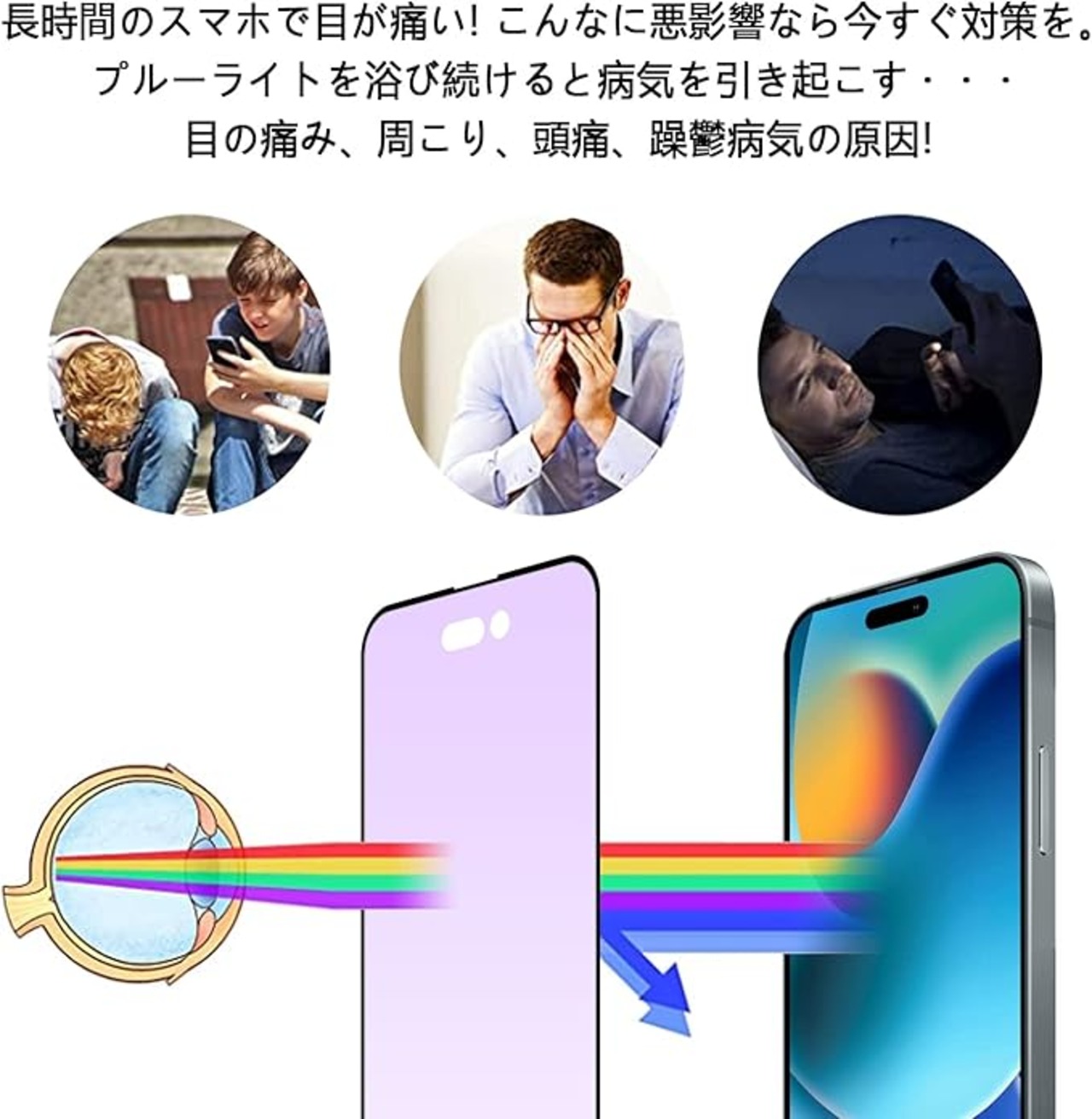 【ブルーライトカット機能】:ブルーライトを浴び続けると人体に非常に有害です。例えば、「疲れ目」「視力低下」「睡眠の質が低下」「頭痛」を引き起こし、体全体に悪影響を与えます。保護フィルムにブルーライト遮断層を追加して、波長400〜450ナノメートルのブルーライトを遮断します(95%)。これにより、画面から散乱する高エネルギーのブルーライトを効果的にフィルタリングして低減し、画面を長時間見ている疲労を軽減できます