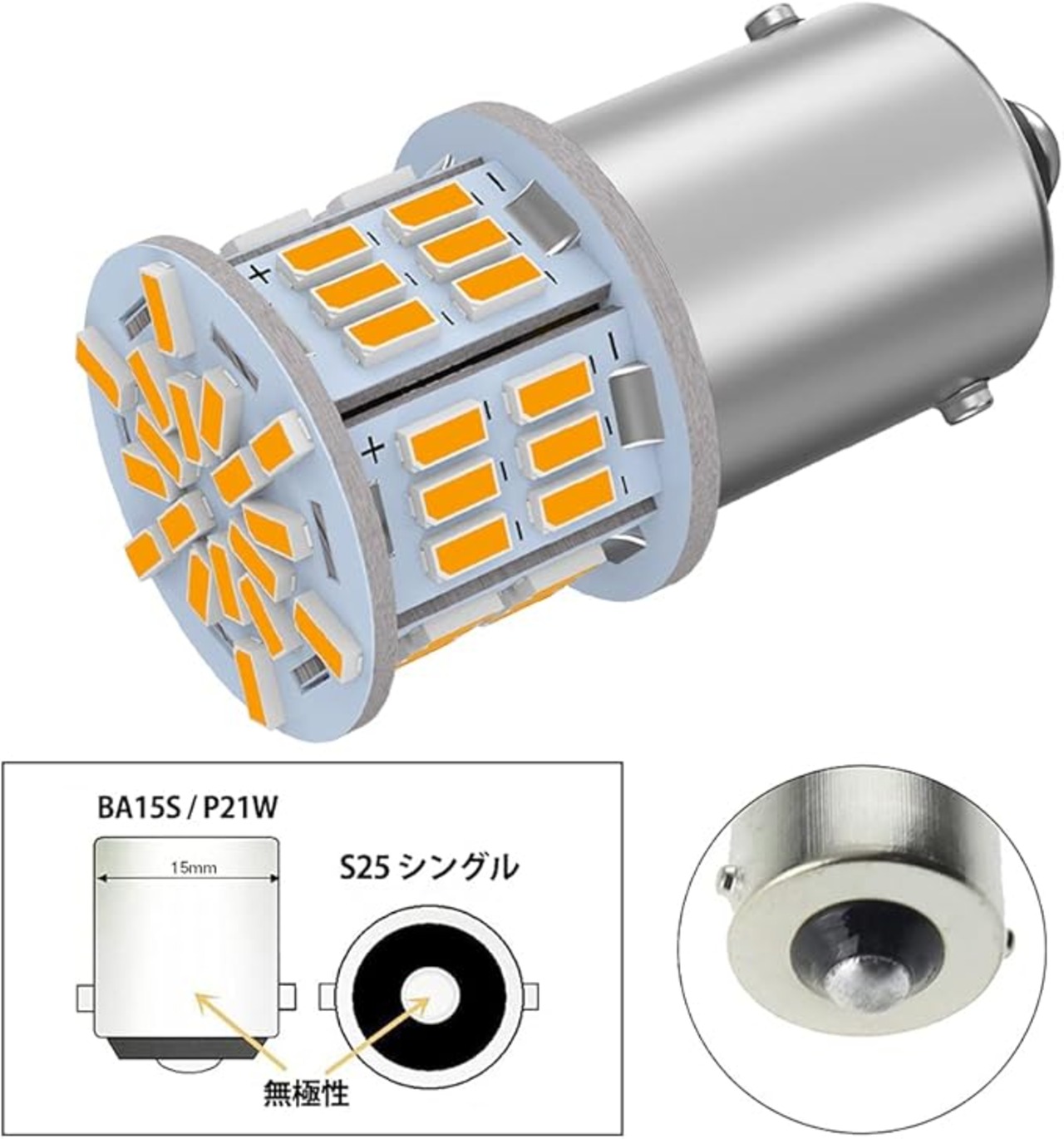 【形状】S25_180 (シングル)BA15S/P21W /1156/ G18 兼用、極性なし、12V-24V専用,1080LM/2個 54LED 3014SMD アンバー 。