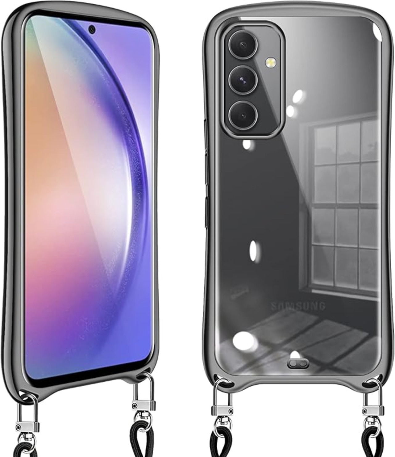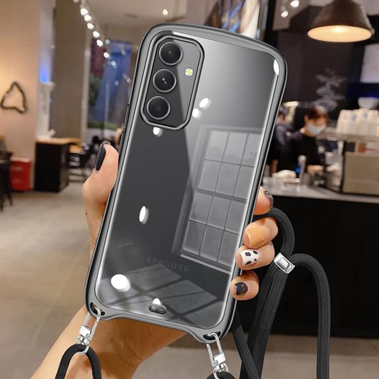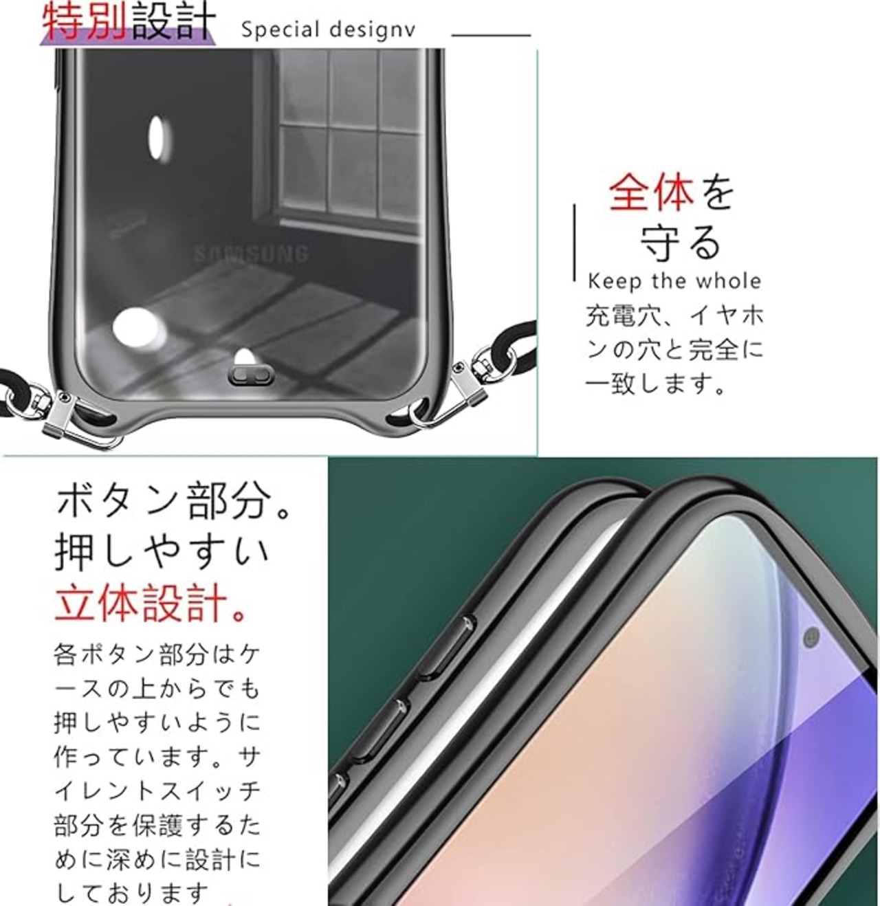 Galaxy A54 ケース クリア ショルダー SC-53D SCG21 ギャラクシーA54 5G スマホケース 耐衝撃 カバー 肩掛け 首掛け 斜めかけケース 可愛い かわいい 韓国 透明 TPU シリコン メッキ加工 TPUバンパー 長さ調整可能 取り外し可能(ブラック)