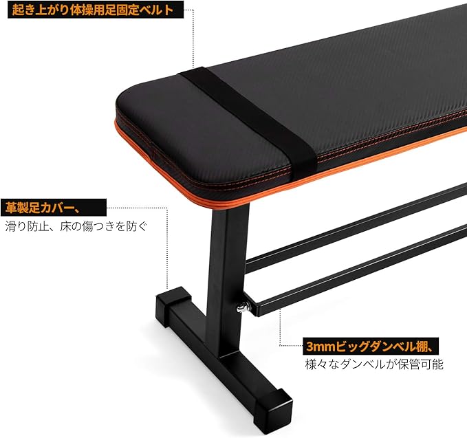 シットアップ固定ストラップ:器用な足ストラップによって、フラットウェイトベンチが簡単にシットアップベンチに転換できます。この装置は、実用的な設計を性能を組み合わせて、すべての練習を効率的にします。初心者ともっと上級のユーザーにとって、家庭ジムのように使われるのに理想的です。
