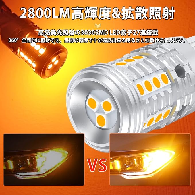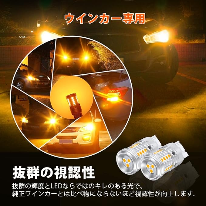 【ハイフラ防止機能内蔵】T20 LED ウィンカー 通常のLEDは純正球より消費電力が低いので、玉切れを起こしたと認識し誤作動を起こしてしまいハイフラ状態になります。そのために、別途ハイフラ対策をする必要があります。本製品は、小型のハイフラ抵抗をバルブ内に内蔵しているので、面倒なハイフラ対策・加工は必要がありません。