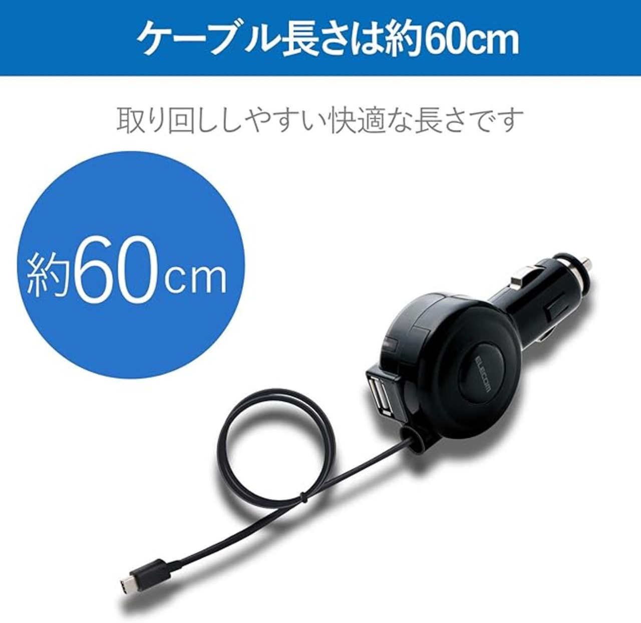 エレコム シガーチャージャー/Type-C/リール/60cm/3A/ブラック