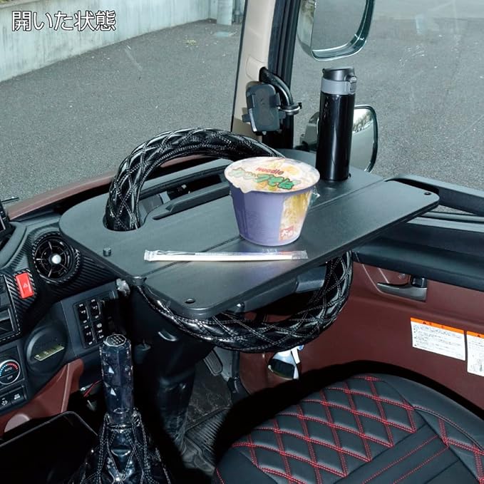 【 折り畳みができる便利なトラック用テーブルです。 】 【 狭い車内でも使い勝手が良い。 】 【 小物などを置いても転がりなどを防ぐ溝を設けているので安心! 】 【 タブレットやスマホを挿入して縦置きも可能です。食事をしながら動画が見れます。 】