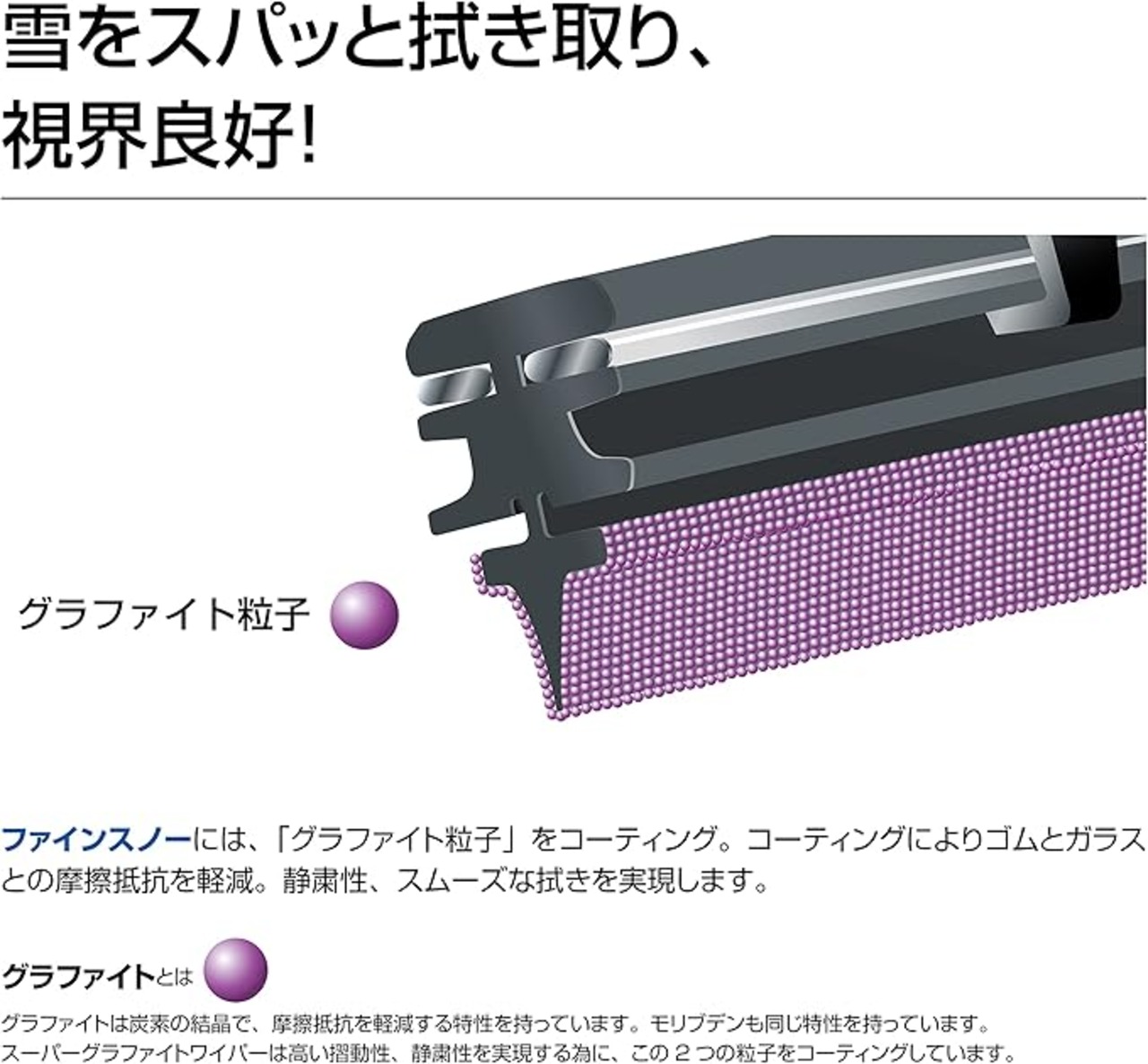 ファインスノーワイパーは、高品質天然ゴムを採用しゴム表面には摩擦抵抗を軽減する「グラファイト粒子(黒鉛)」をコーティングしています。不快な音、ビビりのないスムーズな払拭で雪、雨、泥ハネをスパっと拭き取ります。
