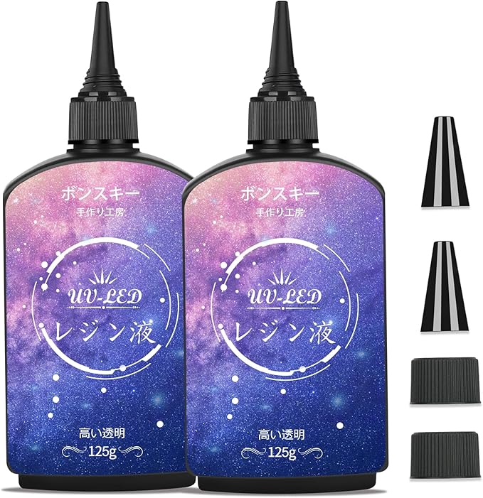 特別な注意:(Bonsky)と(ボンスキー)は同一限定商品です。現在パッケージデザインをリニューアルしておりますが、日本地域では(ボンスキー)限定商品を使用いたします。パッケージ内容:Bonsky(ボンスキー) UVレジン液 125g*2、尖ったボトルキャップ*2、アルミフィルム封止 オープナー*1。ご質問がございましたら、お問い合わせください。