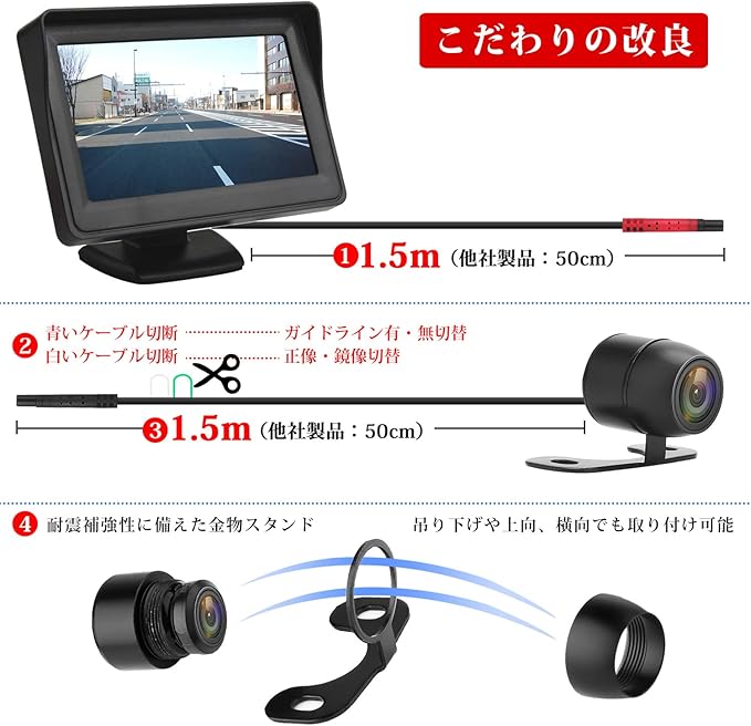 【お楽にDIY可能】正像・鏡像切替 ガイドライン有・無切替が可能タイプのカメラに改良しました!コードを切断することで、バックカメラ用鏡像やフロントカメラ用正像を選択できます!(デフォルト:正像 ガイドライン非表示) バックカメラは吊り下げや上向、横向でも取り付け可能です。角度はステーを曲げて調節できるので、取付場所も広がります。