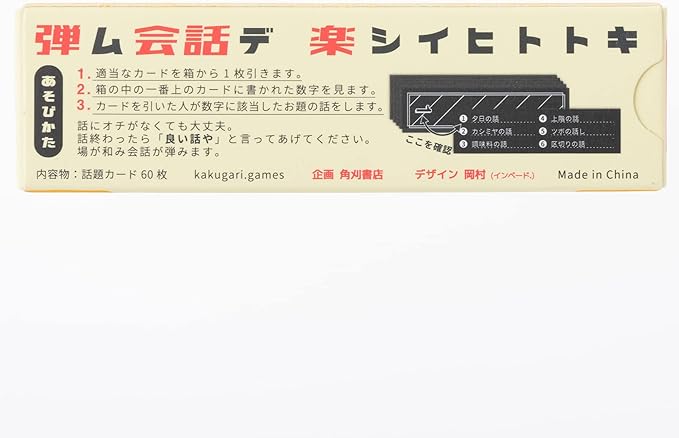 遊び方は 1.適当なカードを箱から1枚引く 2.箱の中の一番上のカードに書かれた数字を見る 3.数字に該当したお題の話をする 話にオチがなくても大丈夫。 話終わったら「良い話や」とみんなで言ってあげ てください。 場が和み会話が弾みます。