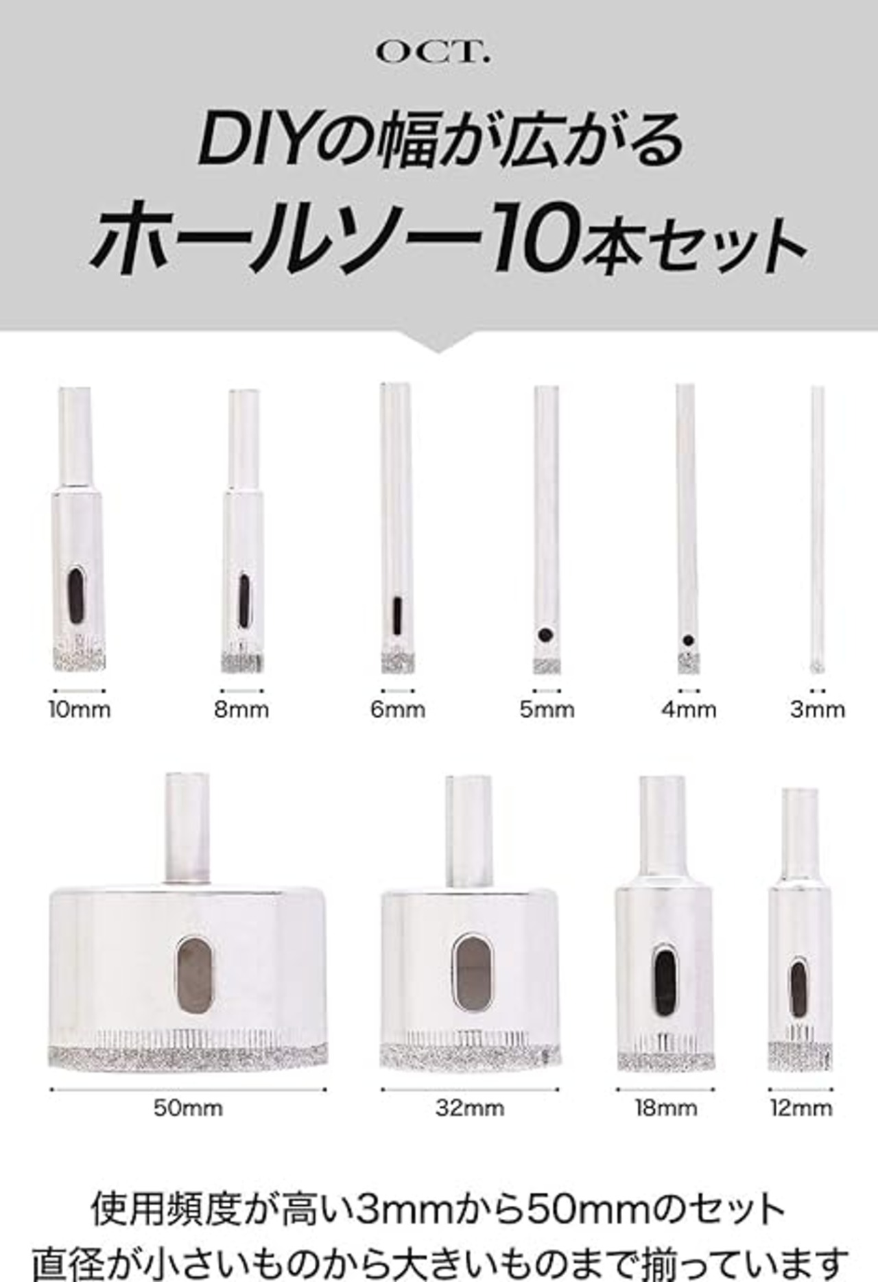 ✅2【 サイズ別、10本セットです! 】 「OCT.」製のダイヤモンドホールソーは、3mm/4mm/5mm/6mm/8mm/10mm/12mm/18mm/32mm/50mmの10本を1セットでご用意しております。直径が小さいものから大きいものまで揃っていますので、本製品1セットでDIYの幅も広がるに間違いなしです!