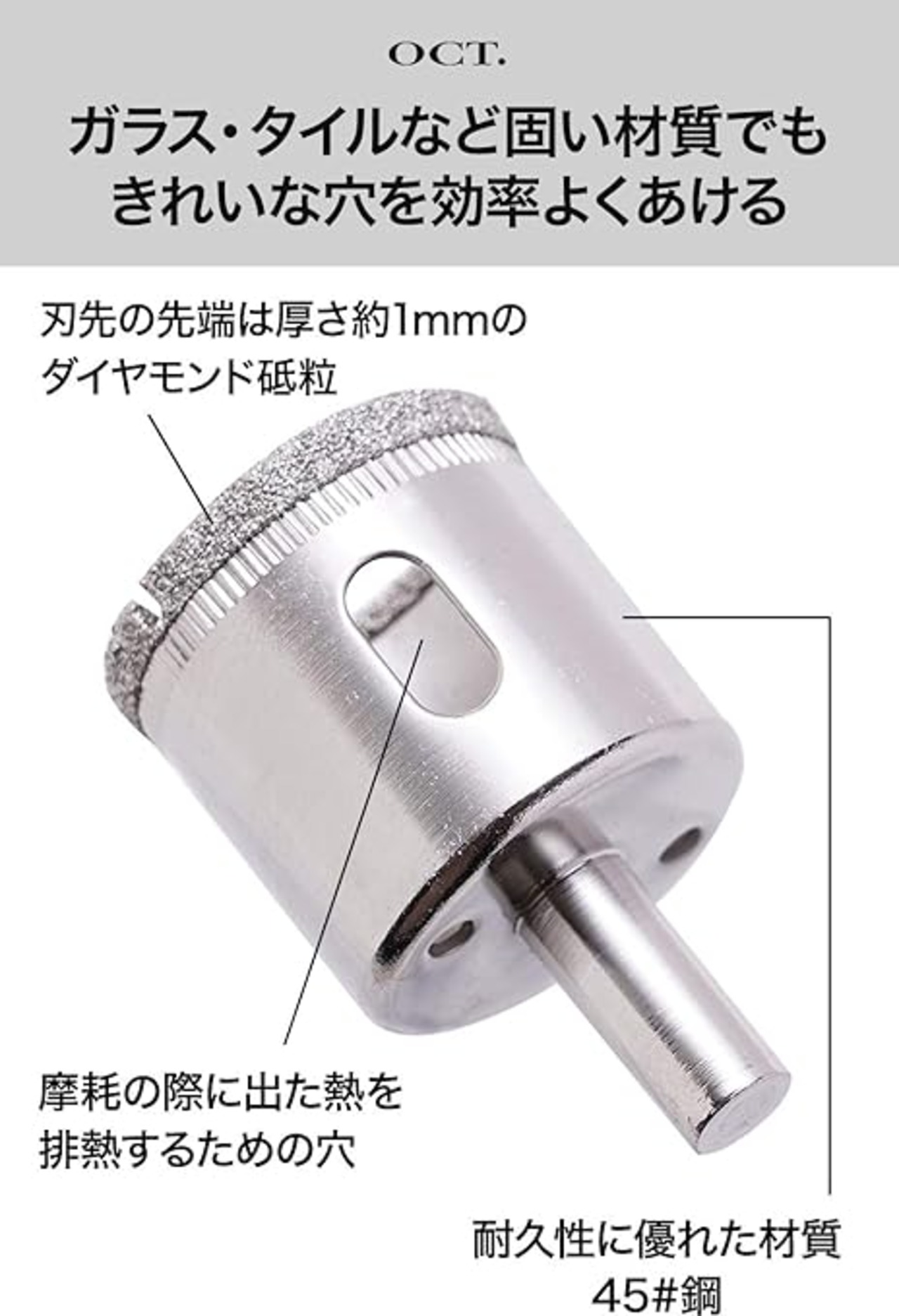✅1【 ダイヤモンドホールソー 】 様々な素材に穴を開けたいときに使用するホールソー。ドリルドライバーやインパクトドライバーに取り付けて使う工具です。ゆがみのないきれいな丸い穴を開けられるためDIYでも大活躍のアイテムです。「OCT.」製のホールソーは、先端にダイヤモンド砥粒付きの「ダイヤモンドホールソー」仕様です。ガラス、タイル、大理石や花崗岩などの硬い材質も、効率よく穴をあけることが可能です。