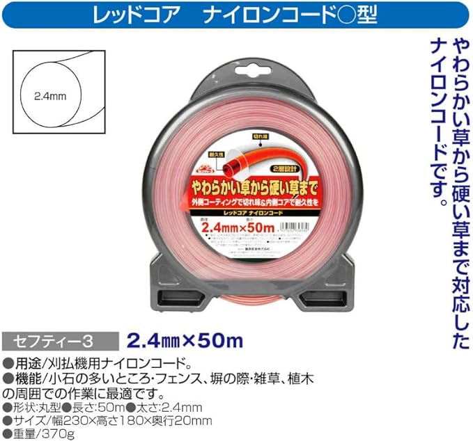 セフティー3(Safety-3) 草刈・刈払機用 やわらかい草から硬い草まで レッドコア ナイロンコード 50m 丸型 2.4mm径