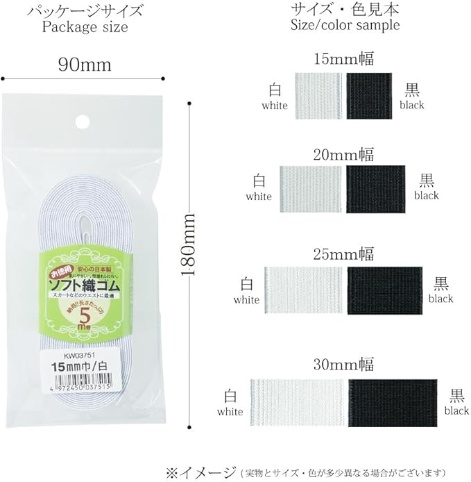 薄くて幅広なテープ状の織ゴムです。衣類のウエストやストレッチベルトに最適です。 日本製 材質:天然ゴム レーヨン糸 伸び率:250% 5m巻