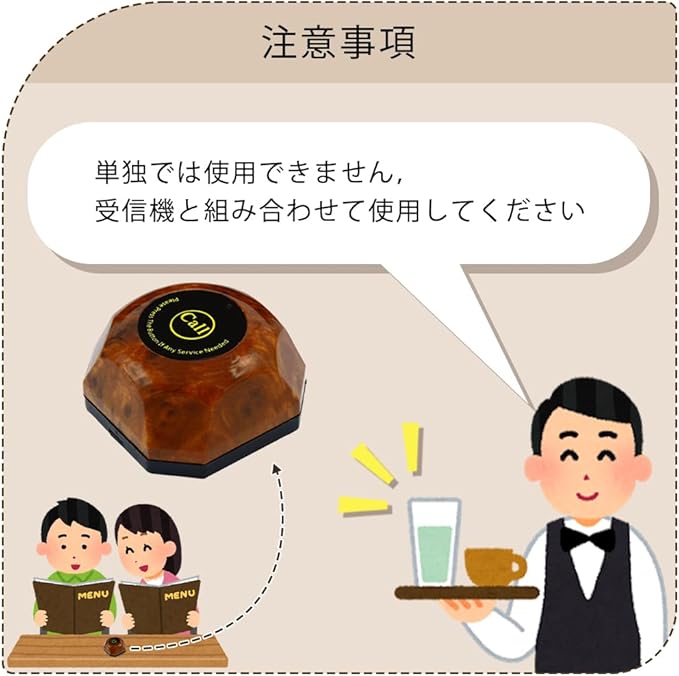 『使用場所』レストランや居酒屋、喫茶店など、商業施設での呼び出しベル、病院や介護施設で使用。におけるお客様からのスタッフ呼び出しに。自宅の老人や子供部屋の呼び出しベルワイヤレスで使用。介護施設でのお客様からの呼び出しに、病院でのナースコールに。