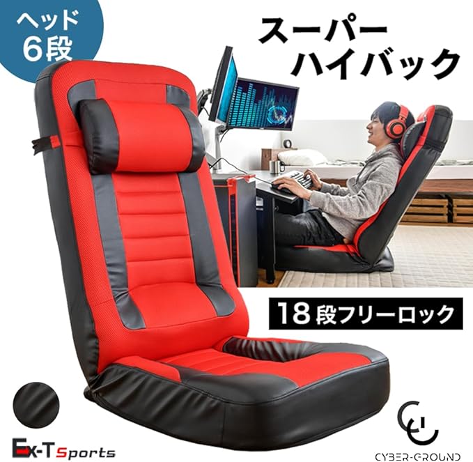 CYBER-GROUND レーシング 座椅子 【スーパーハイバック】 低反発 PVC メッシュ フリーロックギア 18段階 リクライニング パーソナルチェア ゲーミング座椅子 ブラック 15210057(78202)