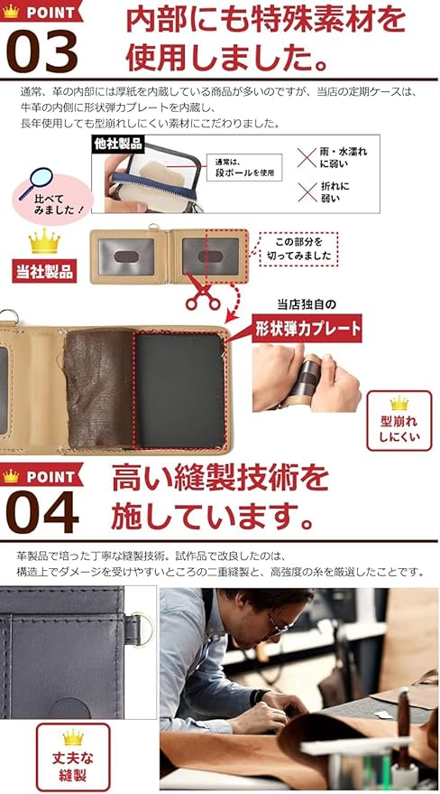 ✨【高い縫製技術を施しています】革製品で培った丁寧な縫製技術。試作品で改良したのは、構造上でダメージを受けやすい箇所の二重縫製と、高強度の糸を厳選したことです。【こだわっている金具】金具は、頑丈で錆びに強い高品質ステンレスを採用しています。使い勝手の良い、便利な仕様です。パスケースに装備したDカンにリールを取り付けてより便利!【リール付き】リールを伸ばして(最大で約40CM)センサーにタッチ、使い終わって手を離すと自動的にリールがもどるので首から下げたままセキュリティカードなどをタッチすることが可能です。