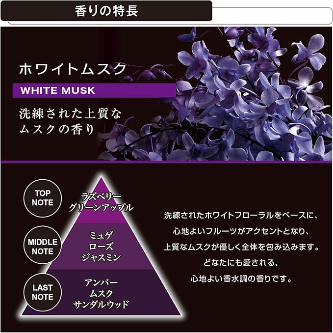 【ホワイトムスクの香り】洗練されたホワイトフローラルをベースに、心地よいフルーツがアクセントとなり、上質なムスクが優しく全体を包み込みます。どなたにも愛される、心地よい香水調の香りです。