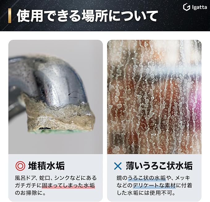 ✅【ご利用場所について】鏡に付いたうろこ状の水垢や、メッキなどのデリケートな素材に付着した水垢にはご利用頂けません。
