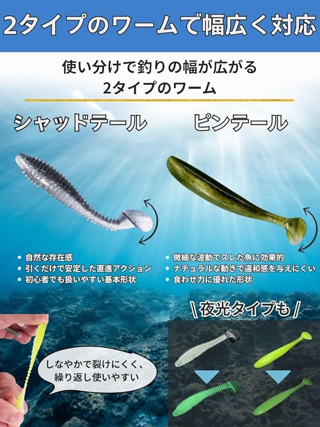 【実釣性能を高めるシャッドテールワームとナチュラルアクションのピンテールワーム】セットに含まれるワームは、シャッドテールとピンテールの2種類のワームタイプなります。シャッドテール形状が水の抵抗を受けてナチュラルに揺れ動き、魚に自然な存在感を与えます。水押しが強く広範囲の魚にアピールでき、引くだけでまっすぐ泳ぎ自然な動きが出せるため初心者にも扱いやすいです。ピンテール形状はテールが水流やロッドアクションによって微細に動き、ナチュラルな波動を生み出します。強すぎない動きが、プレッシャーの高い状況やスレたバスに効果的であり、微波動で魚に違和感を与えず、食わせ能力が高いです。どちらのワームタイプも視認性の高いカラーと柔軟な動きにより、ソルト(海水域)でも淡水(川、湖)でも活躍します。アジ、メバル、カマス、ハタ、バスなど多様な魚種に対応可能です。ワームは透明感のあるグロータイプやナチュラル系、アピール系カラーをバランス良く揃えています。