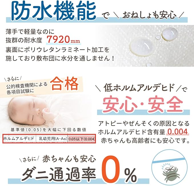 【安心の耐水度】公的検査機関での耐水度試験で7,920mm (一般的な雨傘生地の耐水度基準は250mm以上) 安心の耐水度なので、おねしょや寝汗で敷布団を汚してしまうのを防ぎ、安心してご使用頂けます。