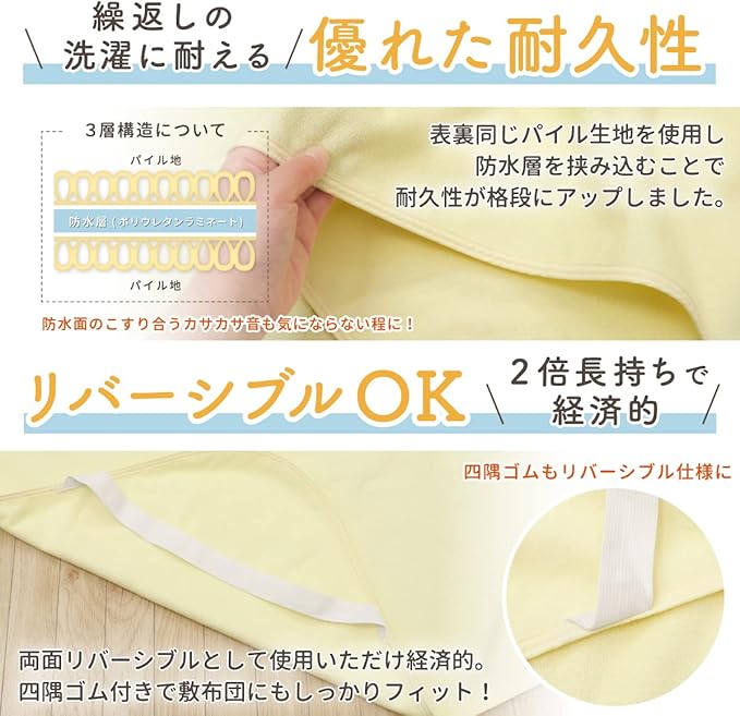 un doudou 3層 防水シーツ 120 210cm セミダブルサイズ リバーシブルタイプ 吸水速乾 抗菌防臭 防ダニ パイル地 綿100% 四隅ゴム付き クリーム 1666-CR/CR